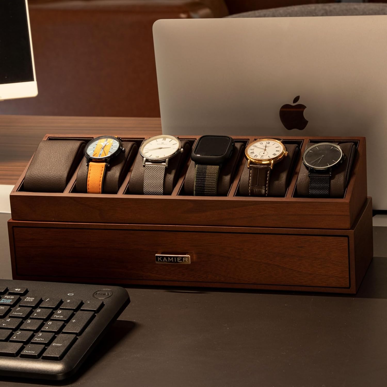 KAMIER High End Wooden Watch Box with 6 Slots & Glass Lid - 2-Layer Jewelry Organizer for Men - Watch Display Case, Ideal ...