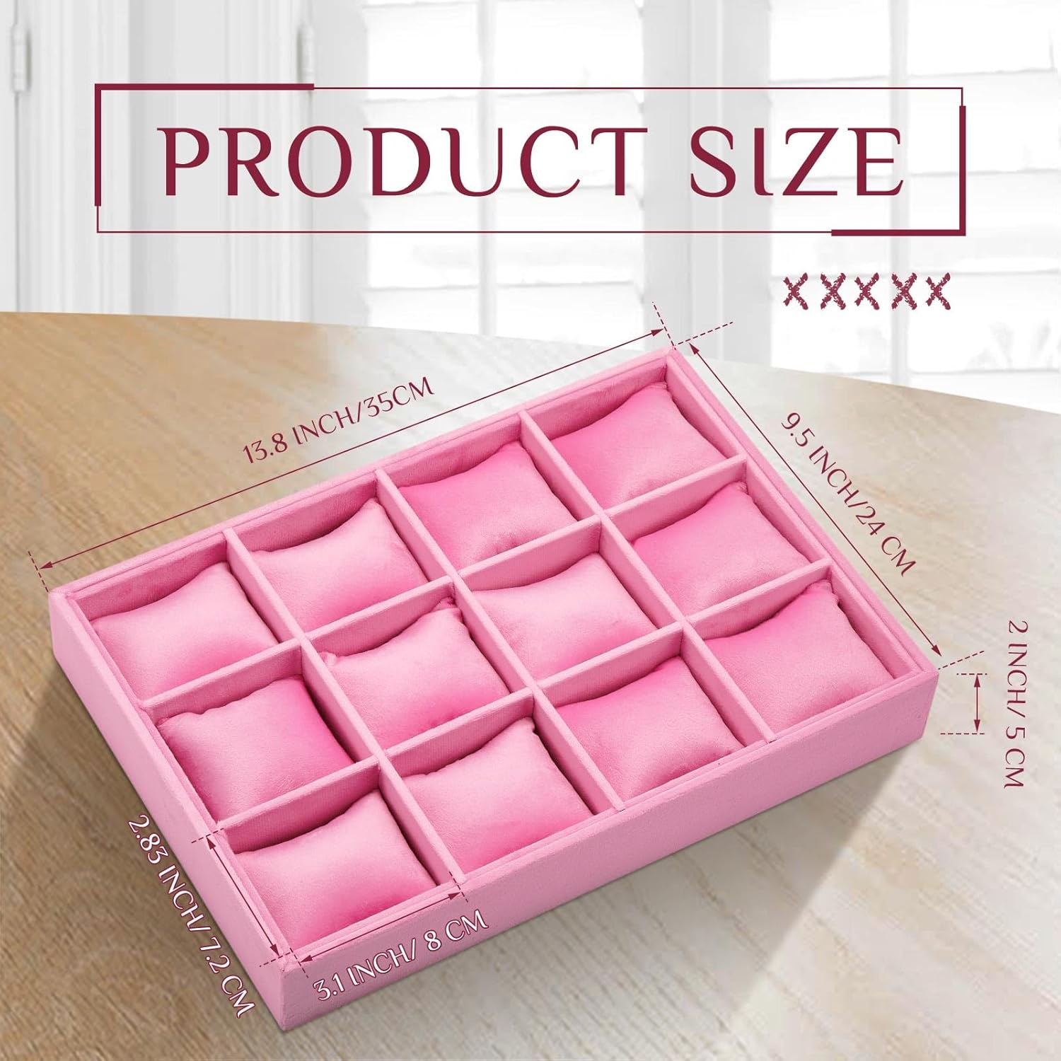Proper Size Fits Most: the size of 12 grid stackable watch organizer is a moderate size, measuring about 13.8 x 9.5 inches/ 35 x 24 cm, about 2 inches/ 5 cm in height, each space is about 3.1 x 2.83 inches/ 8 x 7.2 cm, proper size for you to store your belongs