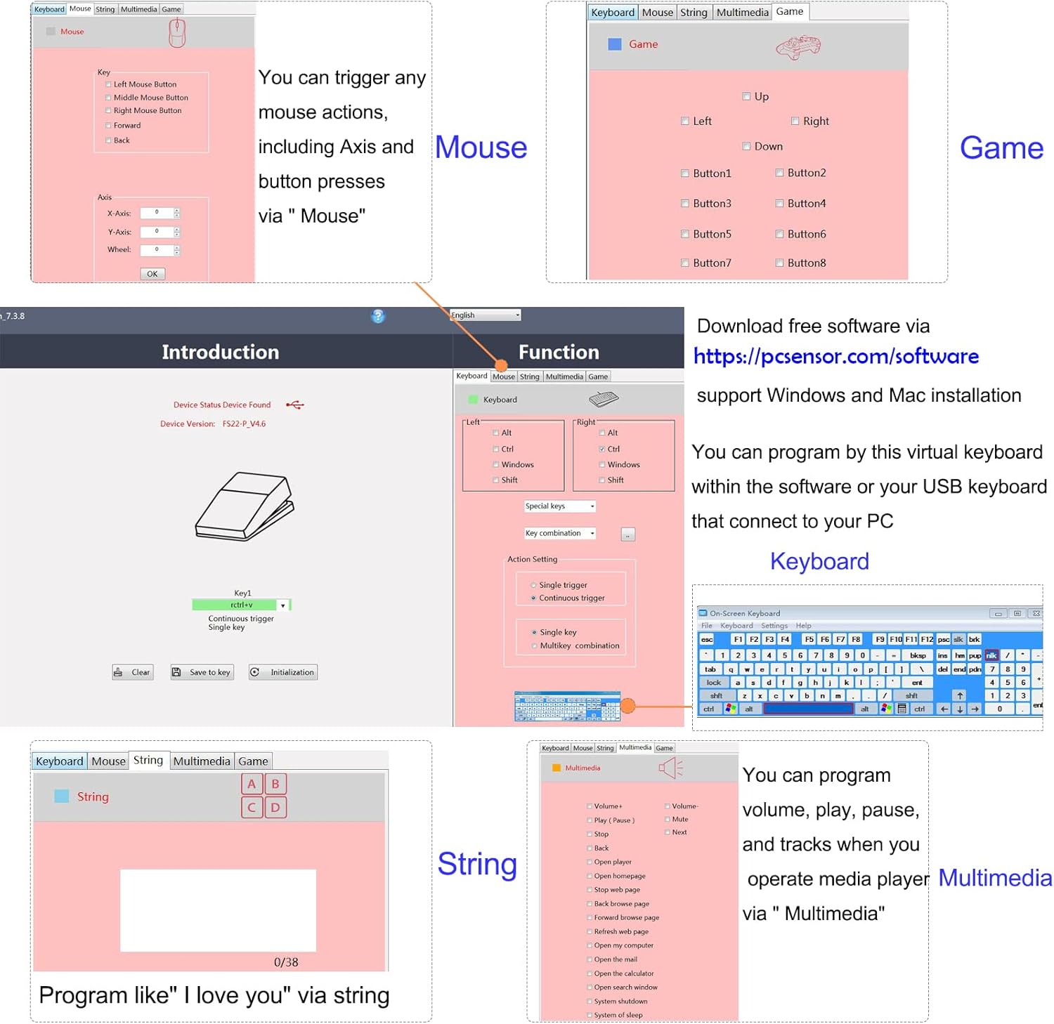EASY TO USE - Plug and Play, software free download from our website, software is easy to setup, and did most of what you would want to of a product, emulation various forms of input. You can assgin many different actions to the pedal, Keyboard/Mouse/String/Multimedia/Game.