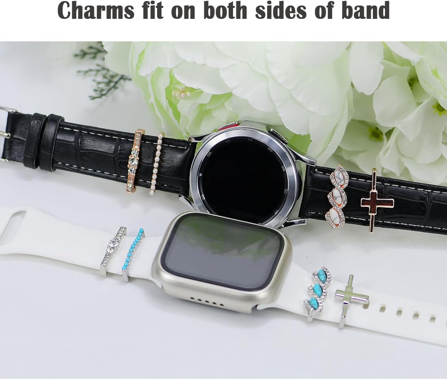 Charms for Both Sides of Bands , Boho Cross Decorative Rings Loops Charms, Rhinestone bling decorative ring loops decorate the silicone and leather strap. These fashion and cute metal charms ornament accessories of iwatch and for samsung Galaxy Watch Pro 5 20 mm smart watch sport silicone Strap /leather band with a width of 20mm or 22mm thickness less than 3mm