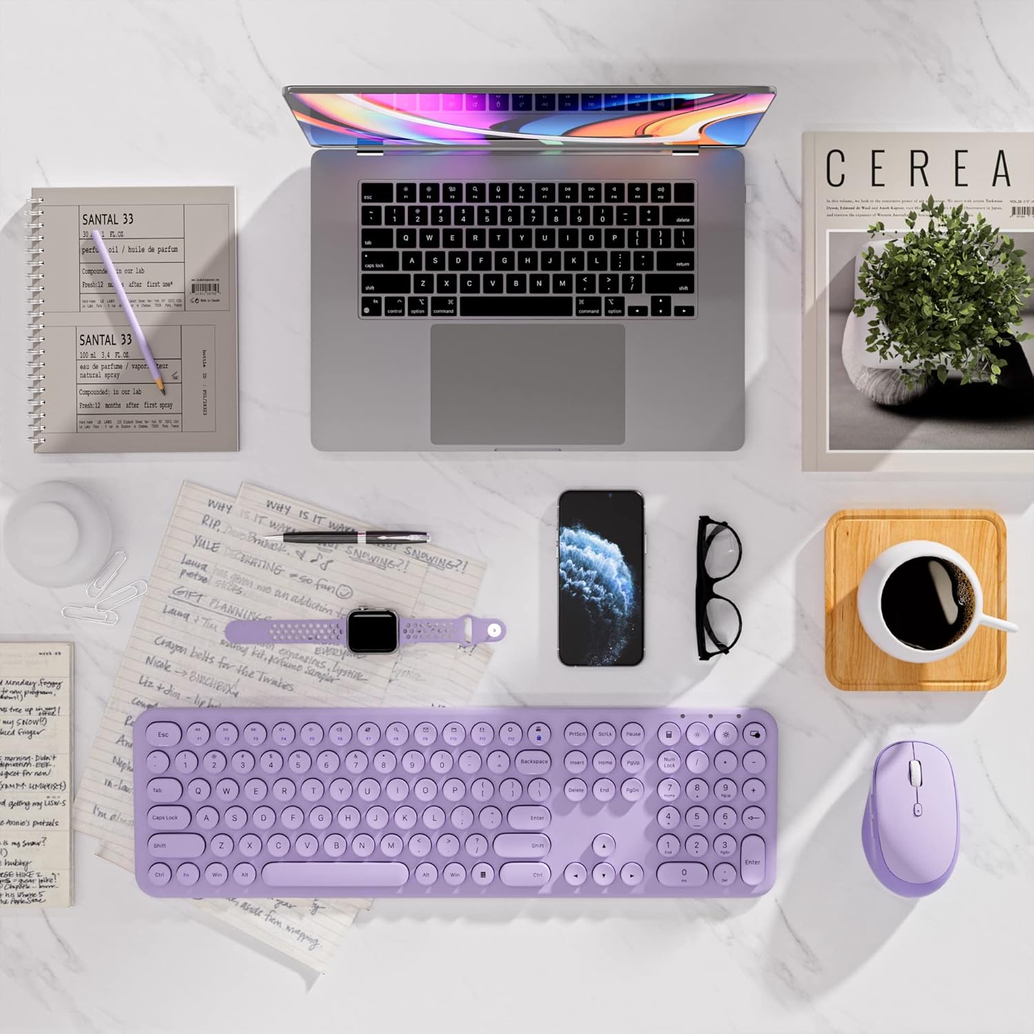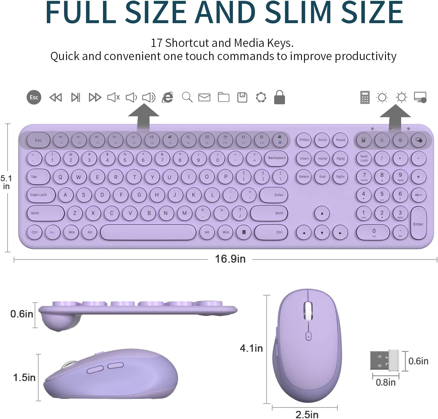 [ Ultra-slim Keyboard ] The spill-resistant design keyboard is with a thickness of 0.15 inch and an ergonomic design with low profile keys and a tilt angle for better typing position. It is a 300gram lightweight full size cute keyboard, making it easy to carry.