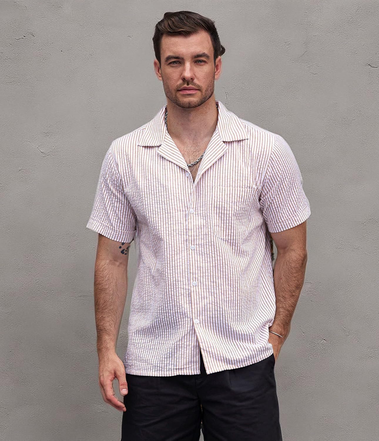 Features: Seersucker shirts for men features cuban collar,Slim Fit, Button Down,Short Sleeves, Stripes with front pockets, which shows your different taste and fashion sense
