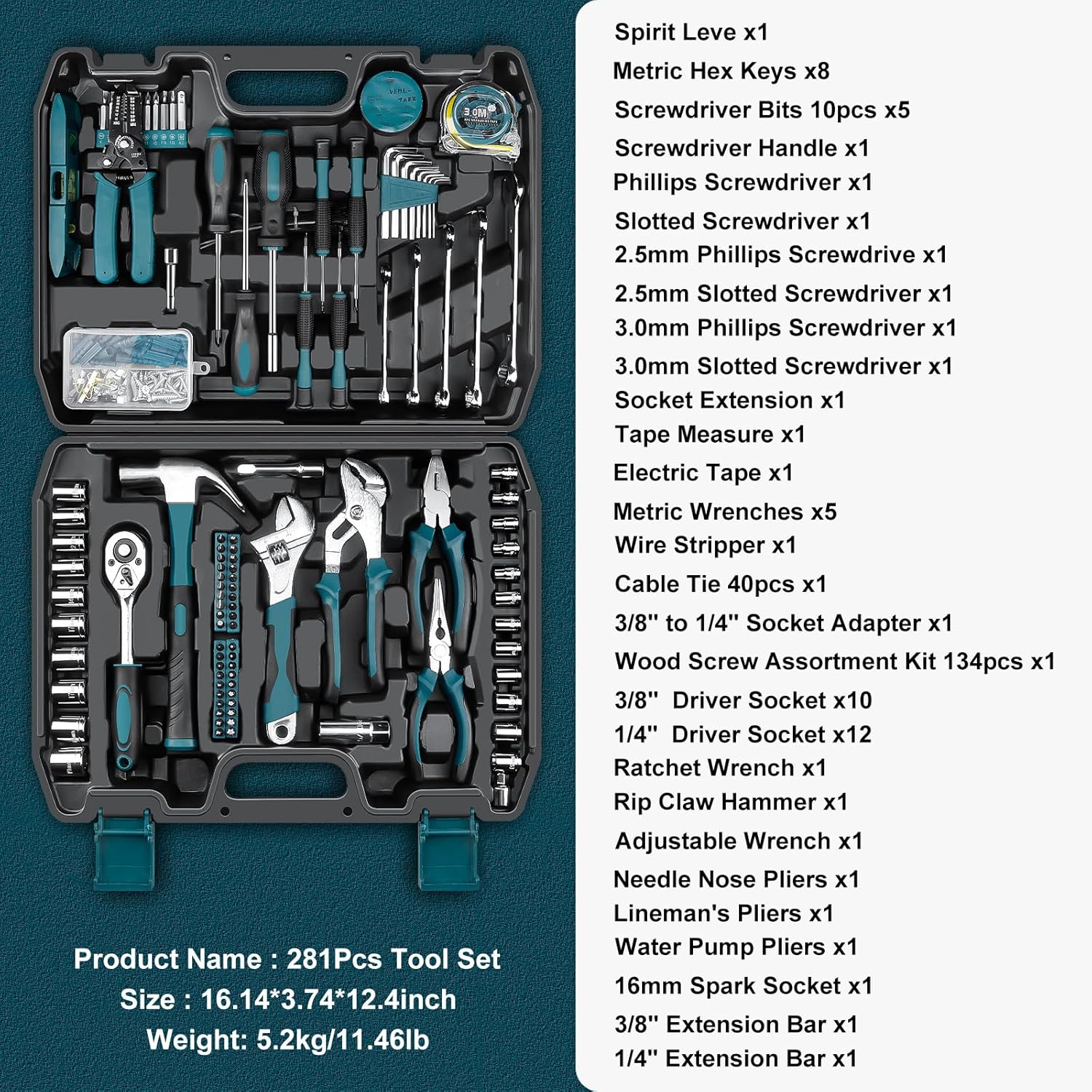 【Wide range of tools】 - Toolkit includes a claw hammer, level, tape measure(Metric and Imperial), hex key sets, Wire Stripper, Screwdrivers, water pump plier, Ratchet Wrench set, adjustable wrench,Combination Wrenchs, Needle Nose Plier, wire plier, diagonal plier, precision screwdrivers, cable ties, electrical tape, Wood Screw Assortment Kit.