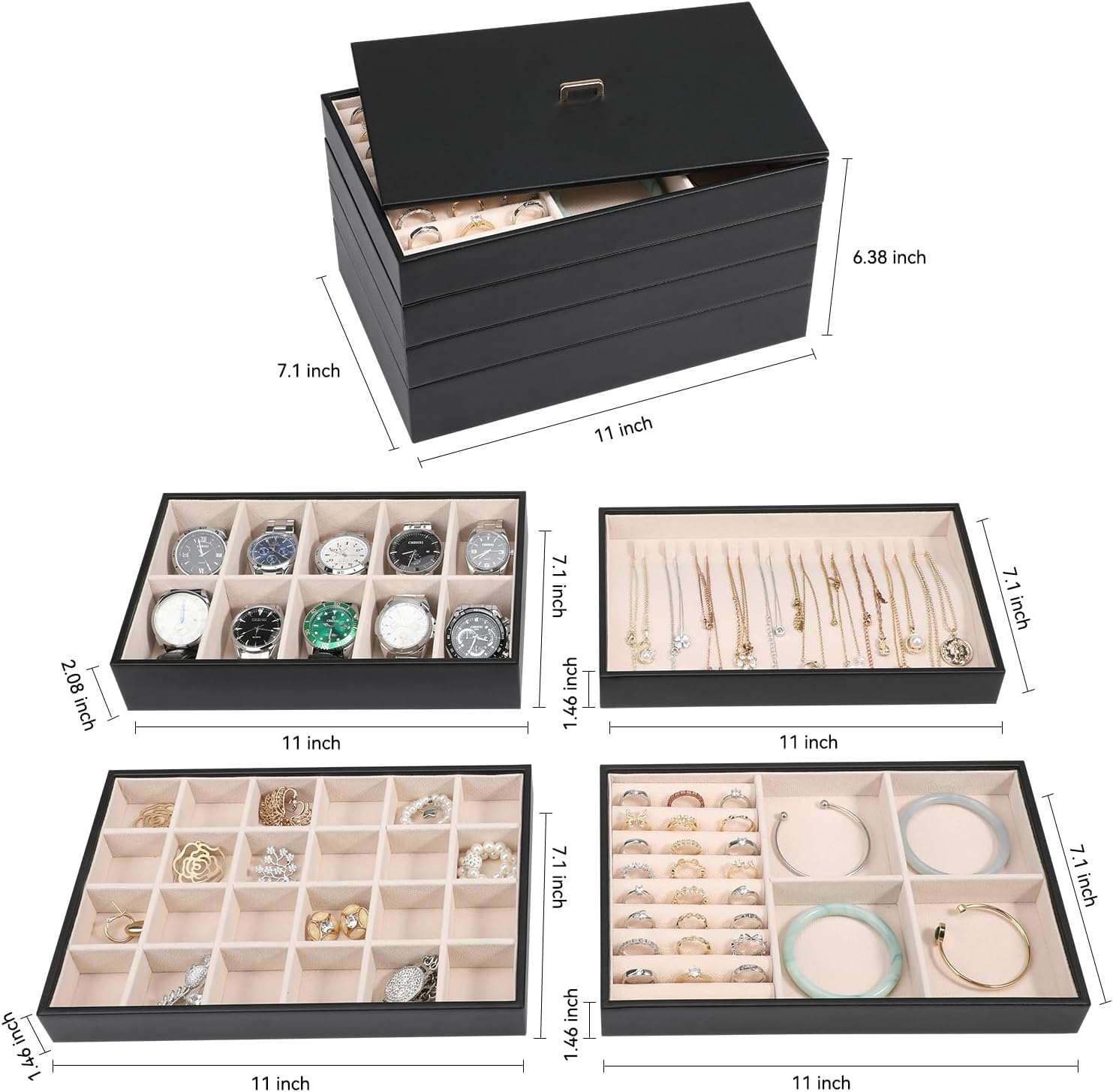 5 in 1 Jewelry Holder: Whole size:11 x 7.1 x 6.38 inches, include 10 hooks tray for necklaces; 24 grids tray for earrings,studs,cuffs; 9 ring rolls + 4 big grids(removable) tray for rings bracelets , deeper tray with 10 slots for watch or sunglasses. You can visually see all of your precious belongs, makes selection easier,while being space savvy! These trays can be used alone or combined.Create your own jewelry box with a variety of colors and styles.