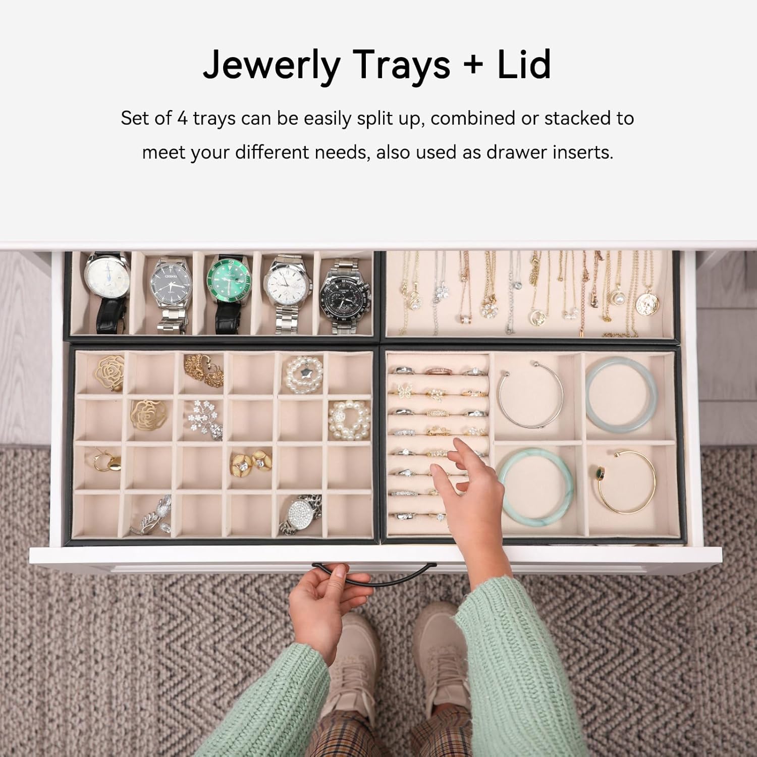 Versatile Tray with Lid: The set of 4 jewelry organizer can be easily split up, combined or stacked to meet your personalized storage needs for men women.Stacks and doesn’t slide, it is a breeze to pack and sit beautifully on your dresser or armoire as a jewelry case, and also can be used as a jewelry drawer inserts. In addition, it is great to display earrings, necklaces, bracelets, rings, brooches, pins, watches in the jewelry store,showcase.