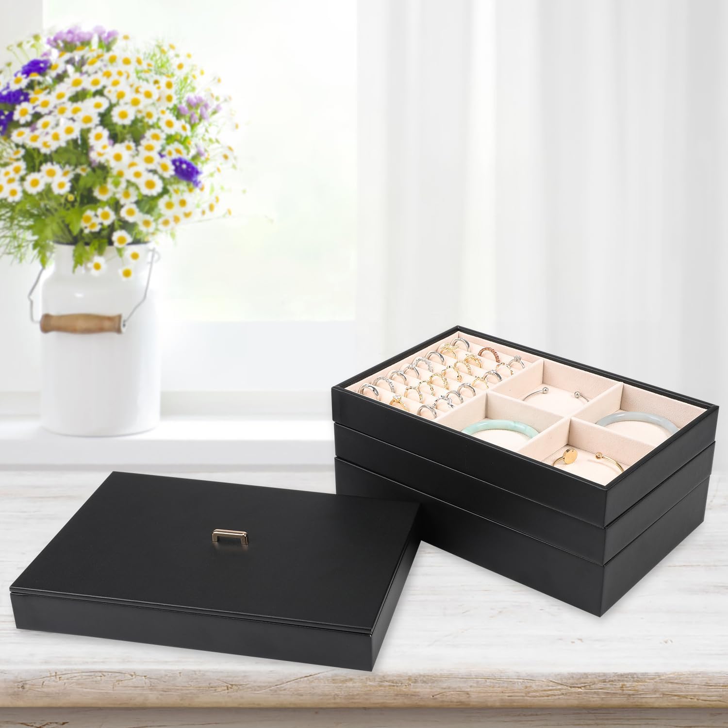 DIY Considerate Details: This jewelry storage case comes with 4 stackable trays and removable compartments create large capacity and different layout. 3 trays with removal baffles can adjust grid to meet different needs and keep all types of jewelry organized, neatly, beautifully displayed.No longer losing your bling.