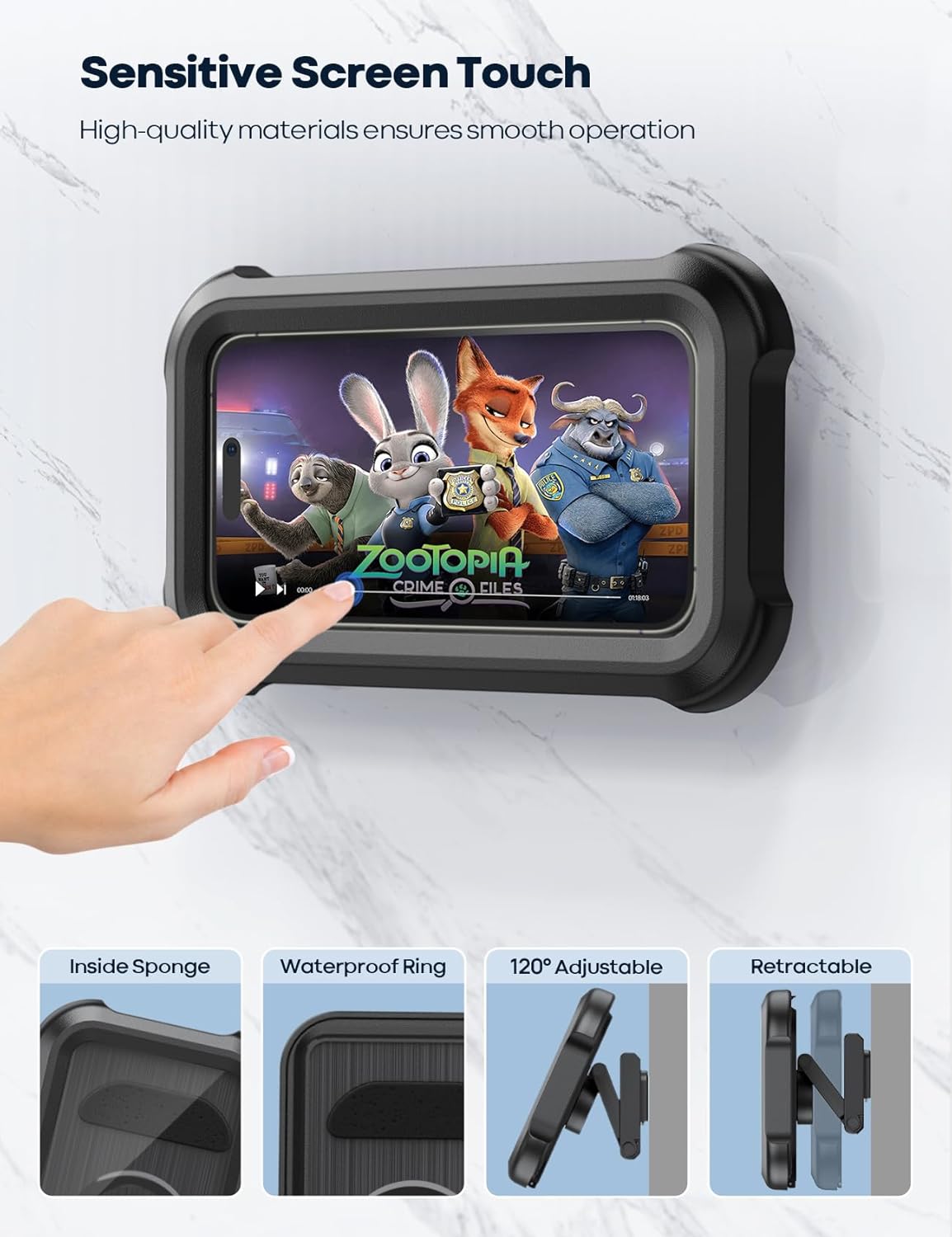 480° Rotation & Adjustable : With the unique rotation and retractable design, this waterproof shower wall phone holder support 120 degree angle adjustment and 360 degree horizontal and vertical rotation, ideal for changing the distance and viewing angle. You can easily play on the phone at your desired position and protect your phone from water while in shower