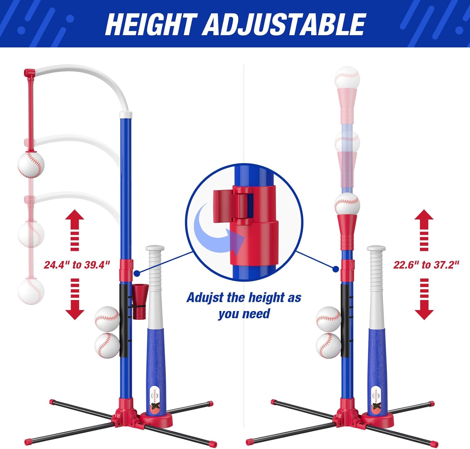 ADJUSTABLE HEIGHT - ①The hanging baseball tee adjusts from 24.4" to 39.4" in height. ②The fixed standing tee adjusts from 22.6" to 37.2" in height. Easy to twist and lock the height, you can adjust different heights for your child. Let the baseball toys grow with your child