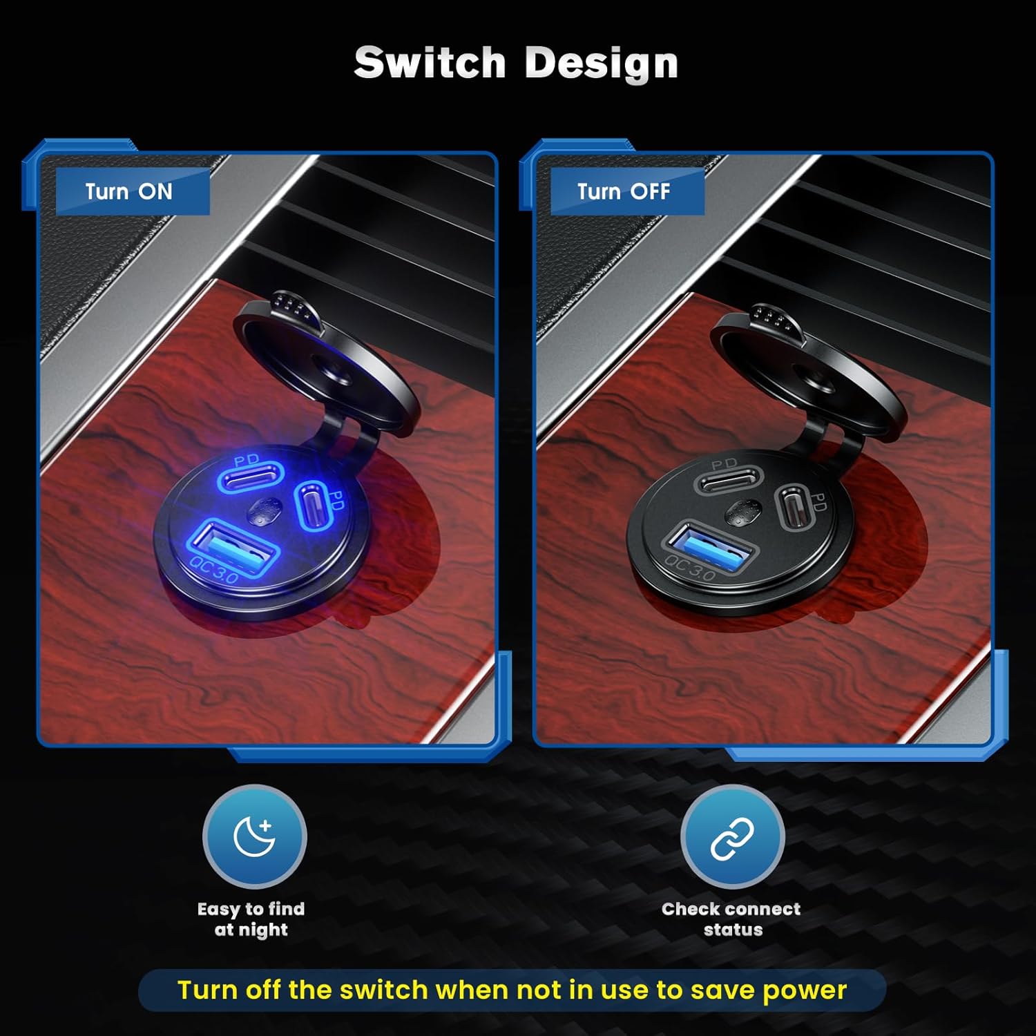 【With safety power switch and blue LED】12v usb socket is designed with an on/off switch for energy saving and protection to extend the life of the equipment. It saves power and does not consume any power when switched off, the blue LED light can help you check whether the circuit is connected successfully, and easily find the charging port in the dark environment.