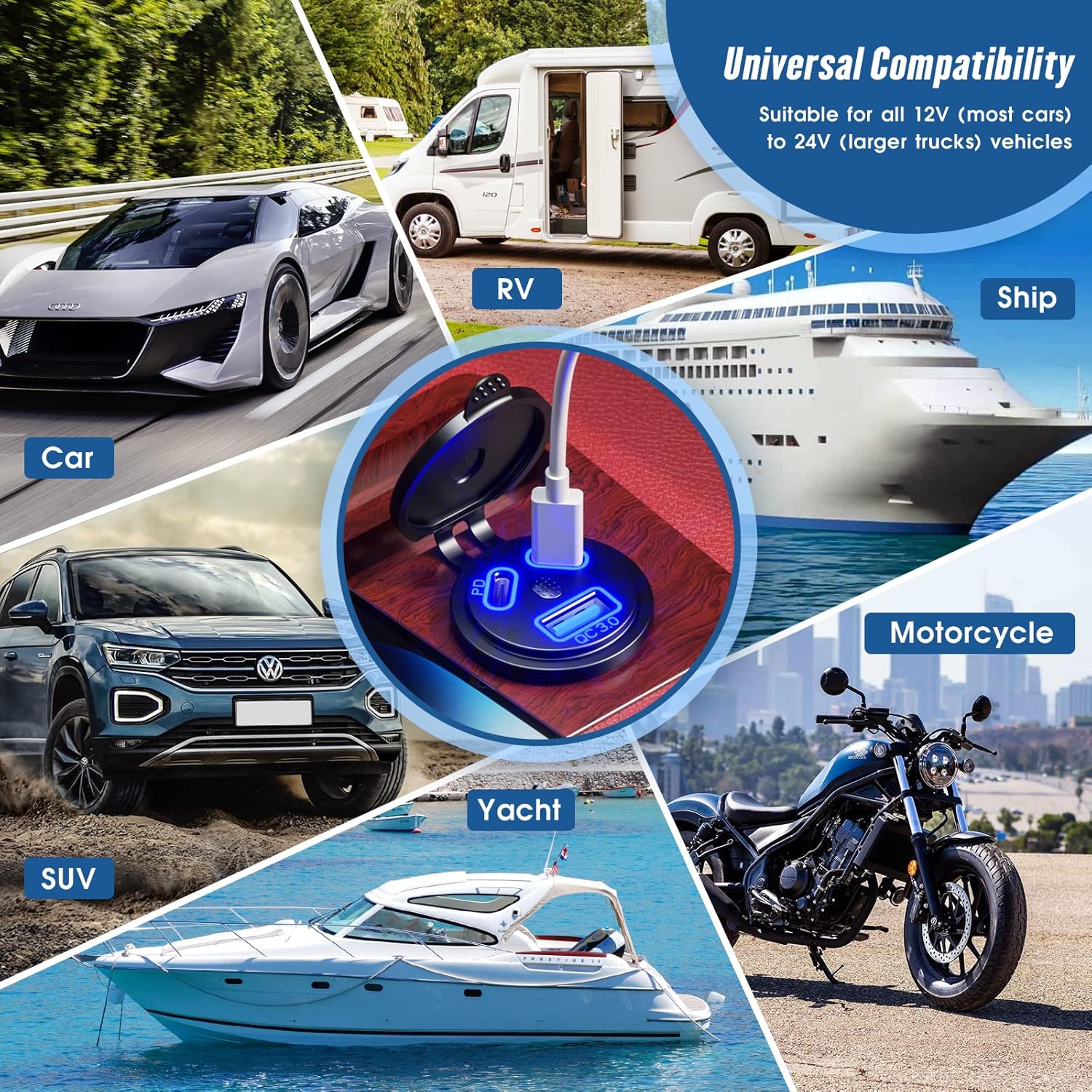 【Widely used】Suitable for most 12-24V DC vehicles such as cars, boats, SUVs, ATVs, RVs, trucks, motorbikes, etc. It is suitable for the dashboard of most vehicles.This USB socket is suitable for charging cellphones, tablets, power banks, video games controllers, sports watch and other digital equipment.
