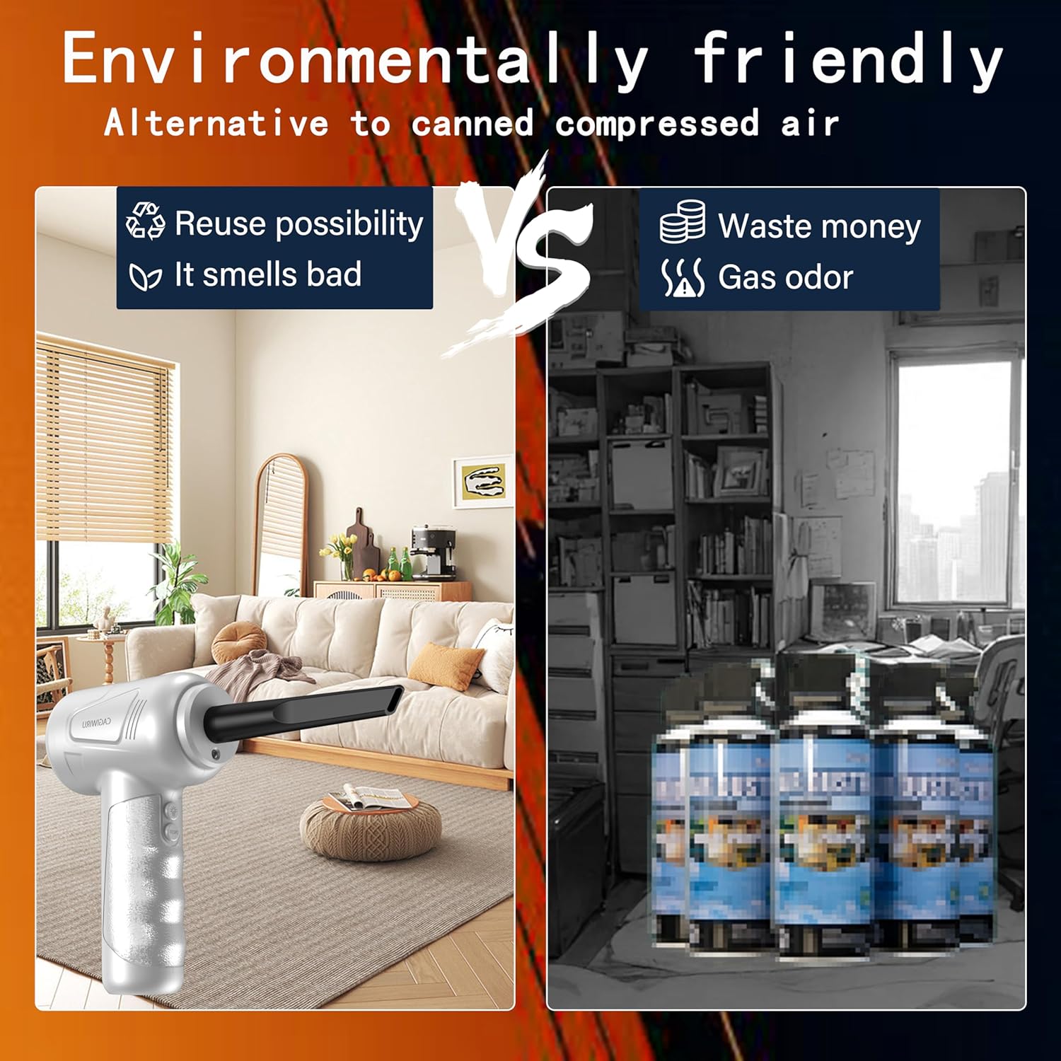 【Powerful Cleaning】Wireless electric air duster max rotating speed is 91000RPM. Continuously provide high-pressure air to remove dust, Can produce super-strong airflow. Super-strong airflow to remove debris and dust from any crevices.Cleans debris and dust from any electronic device, handy in your home or office or car.
