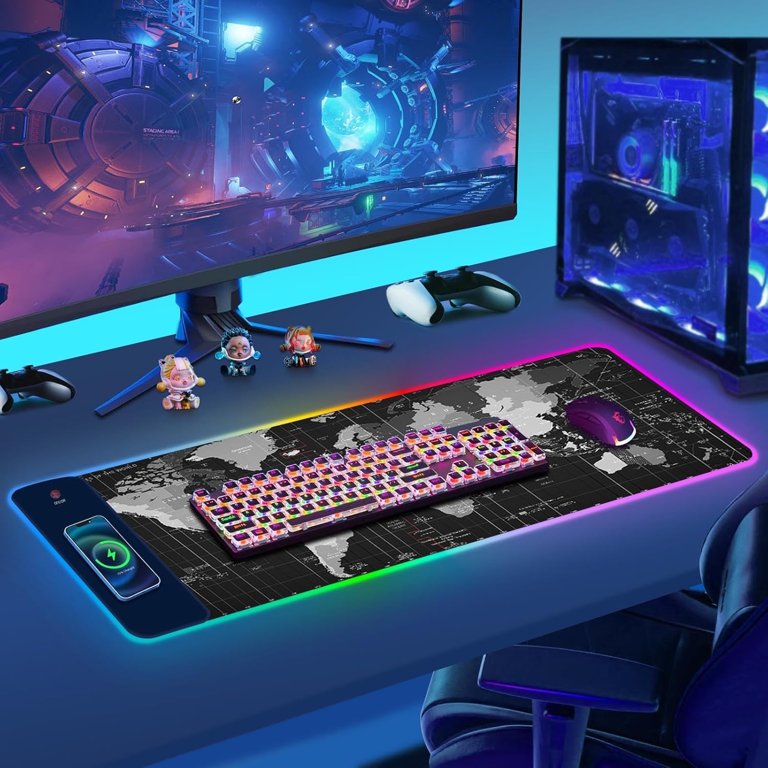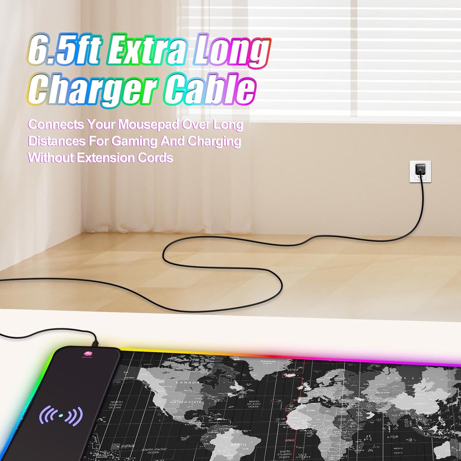 【14 RGB Led Lighting Modes】Super luminous customized 14 lighting modes, including 7 static light modes and 7 dynamic modes, which offers a distinctive atmosphere when playing games or working. Bright, colorful RGB lighting along the entire edge.One button controls light modes. The memory function helps to remember your last light mode choice when switched on. It's the best wireless charging mouse pad and office mat for your desktop.