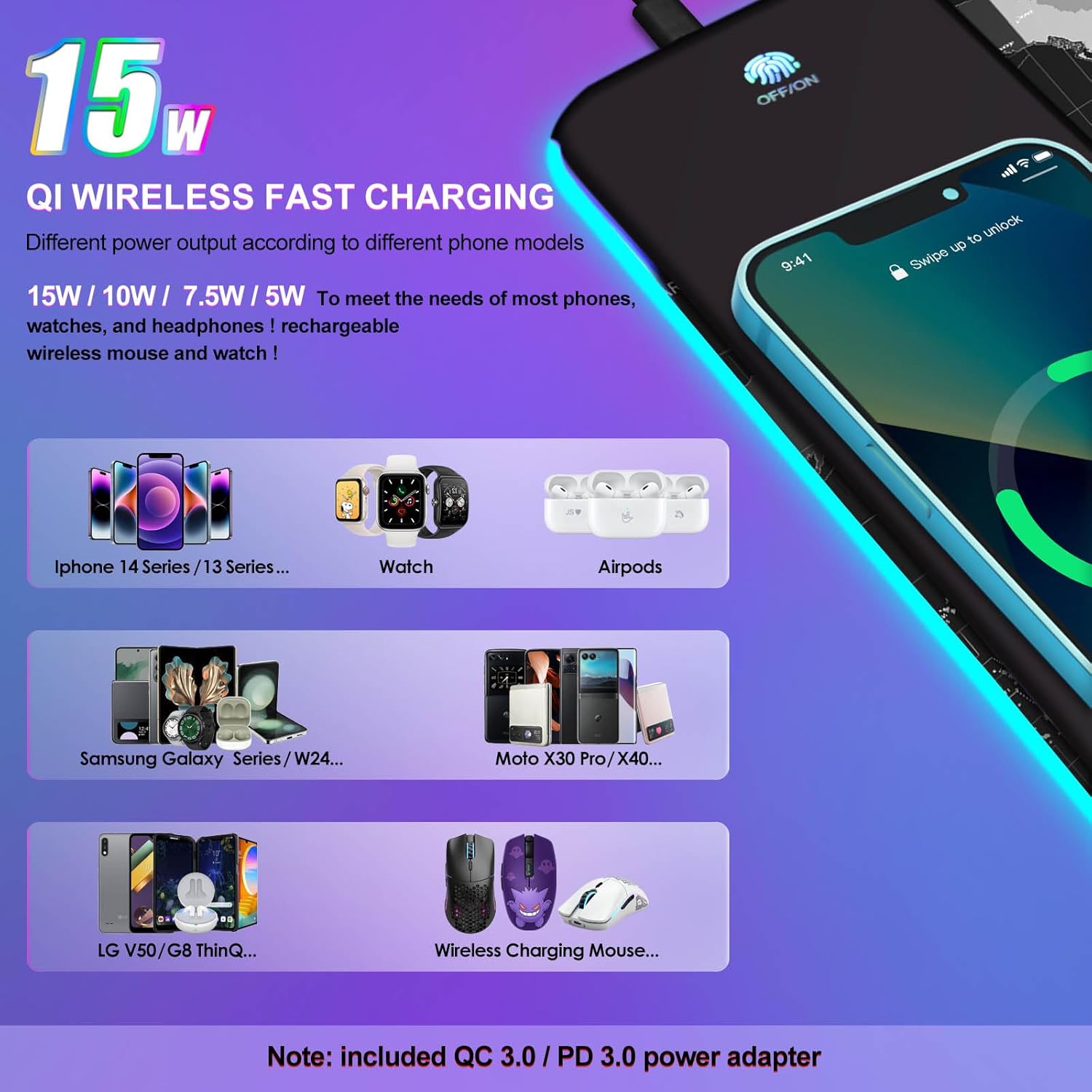 【15W QI Wireless Charging Mouse pad + 30W PD charger 】The Large Mouse pad Built-in 15W wireless fast charging, which comes with a 30W PD charger and a 6.5ft PD 5A fast charging cable. This wireless charging mouse pad supports all QI wireless charging devices. such as Compatible with iPhone 8/X/XR/XS/11/11 Pro/12/12 Pro/12 pro max/13/13 Pro/13 pro max, iPhone 14 / 14 Pro, Compatible with Galaxy 10/S9/S8 Plus, Galaxy Note 9/8, Galaxy Buds and so on