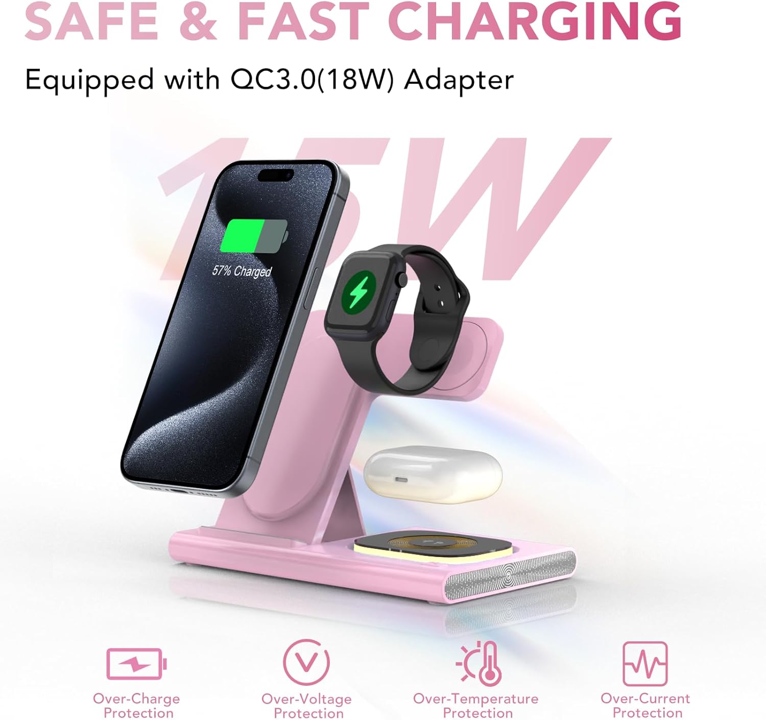 [Safe & 15W Fast Charging] The apple fast wireless charging station is made by ABS+PC & Purity Copper Wire,with Over-current,over-voltage,over-temperature,short circuit protection,foreign substance examination,valid identification of metallism disturbance protection[!!!Remove the Metal or Magnetic objects,Light won't FLASH].Dual-coil design ensures a wider charging area in landscape or portrait orientation,charge wireless phones,headphones with protective case thickness less than 4mm/0.16in.