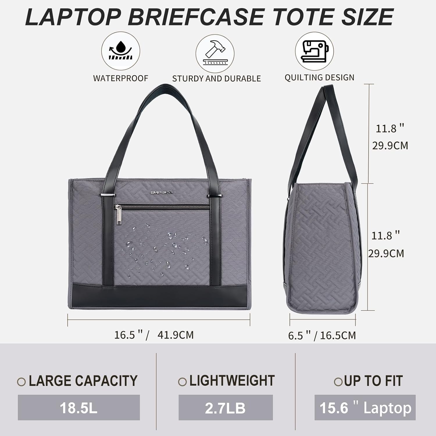 Ideal size handbag: EMPSIGN Tote bag 16.5 inches long x 6.5 inches wide x 11.8 inches high, designed to be spacious and lightweight, providing you with a more comfortable carrying experience. At the same time, it is very lightweight, weighing less than 2.3 pounds and does not appear cumbersome. Suitable for 15.6-inch laptops.