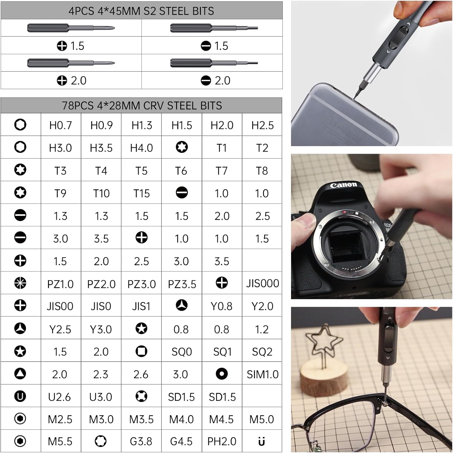 ??The portable screwdriver tool set case measures 18.6*11.8*4.6cm and weighs 1.31lbs, crafted from ABS material. The replaceable magnetic screwdriver bit is made from CR-V tool steel with a high hardness level, ensuring durability and precision, without damaging electronics. Additionally, we have included backup standard bits that are prone to wear and tear.