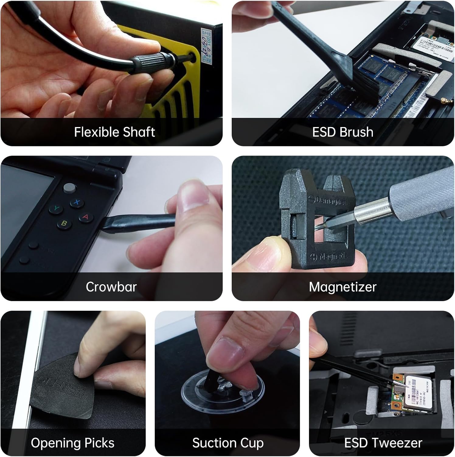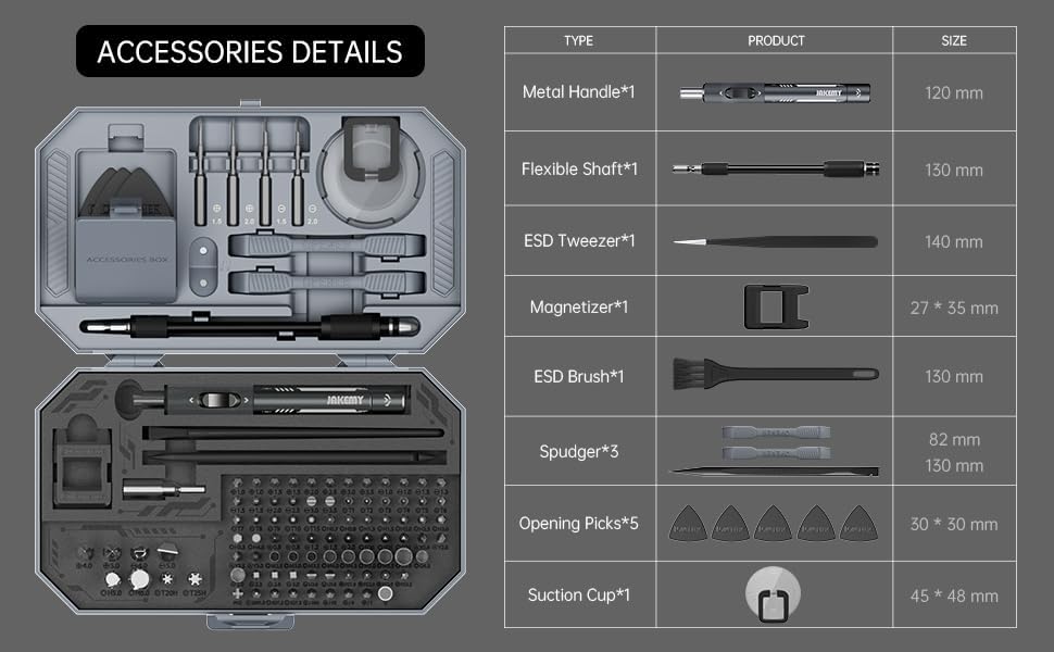 ??The multipurpose screwdriver set includes phillips bit, slotted bit, torx bit, hex bit, pentalobe bit, square bit, triwing bit, socket bit, gamebit, triangular bit, u-type bit, pozidriv bit, standoff bit, jis bit, in ph2 bit, ejector bit and other bit. There are opening picks, crowbars, pry bar and suction cups can be used to remove the screen, also ESD tweezers and brush, flexible shaft and 2 in 1 magnetiser.