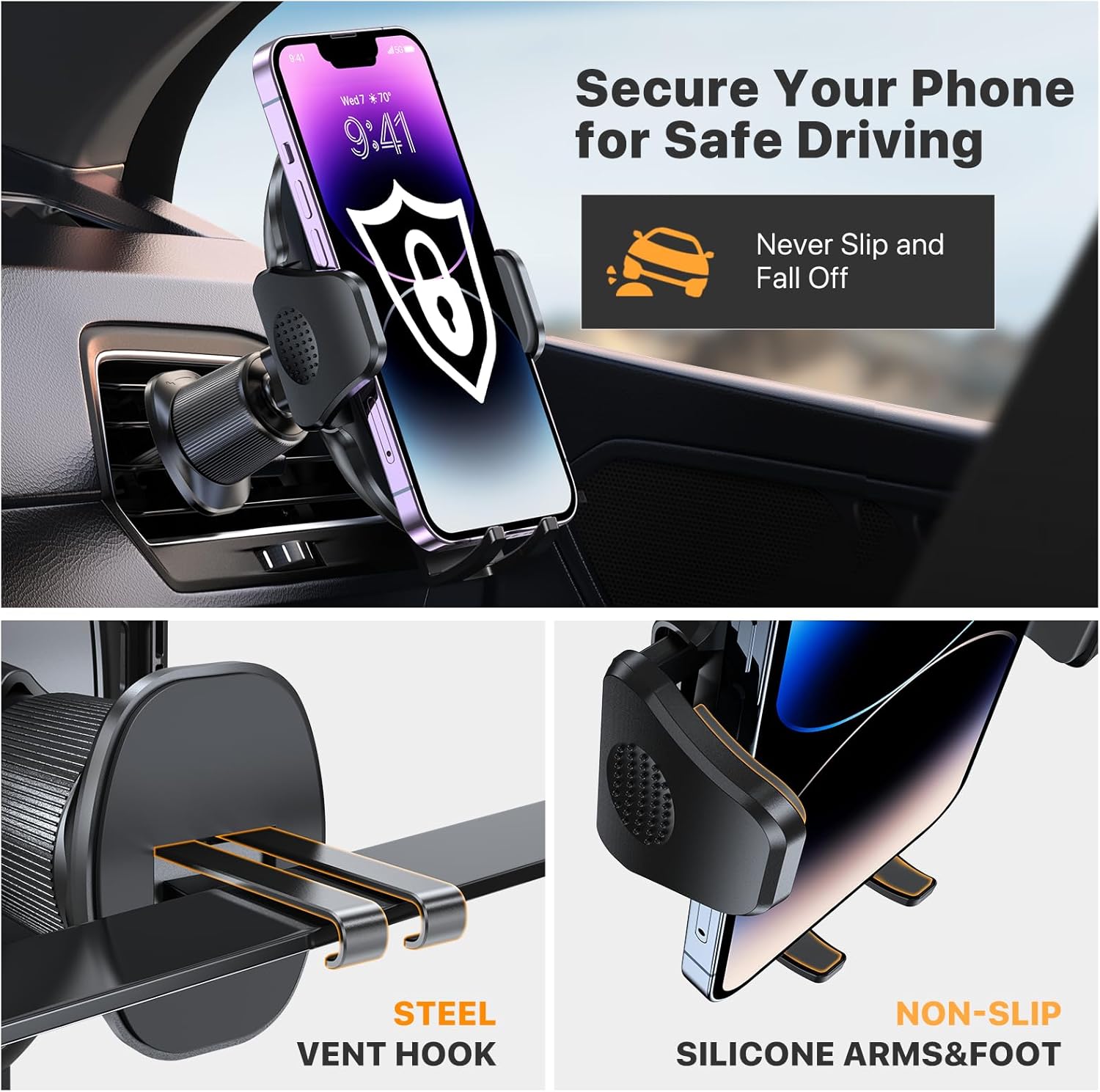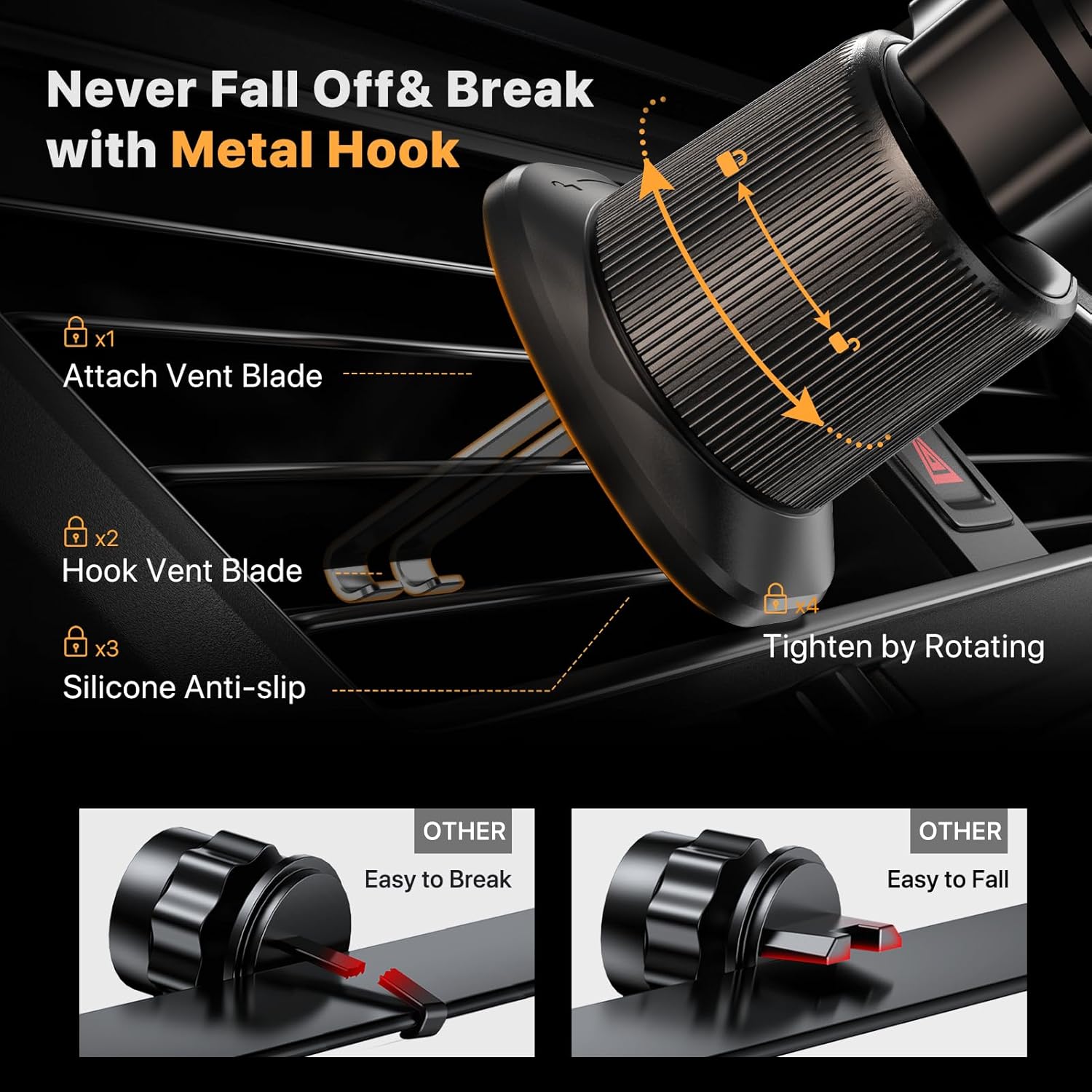 Never Fall Off-Metal Hook Design: Miracase car phone holder adopts simplified locking design. The steel metal hook(with silicone pad and mat) will catch one of car air vent blades and provide excellent strudiness. It will work well for your car even in extremely harsh environments.