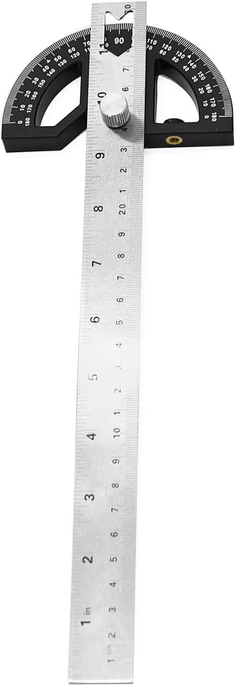This miter saw protractor has the function of a ruler and a corner measuring tool. Rotating to the scales to 180°, the angle finder tool can be used as a ruler of 200mm and 12 inch.