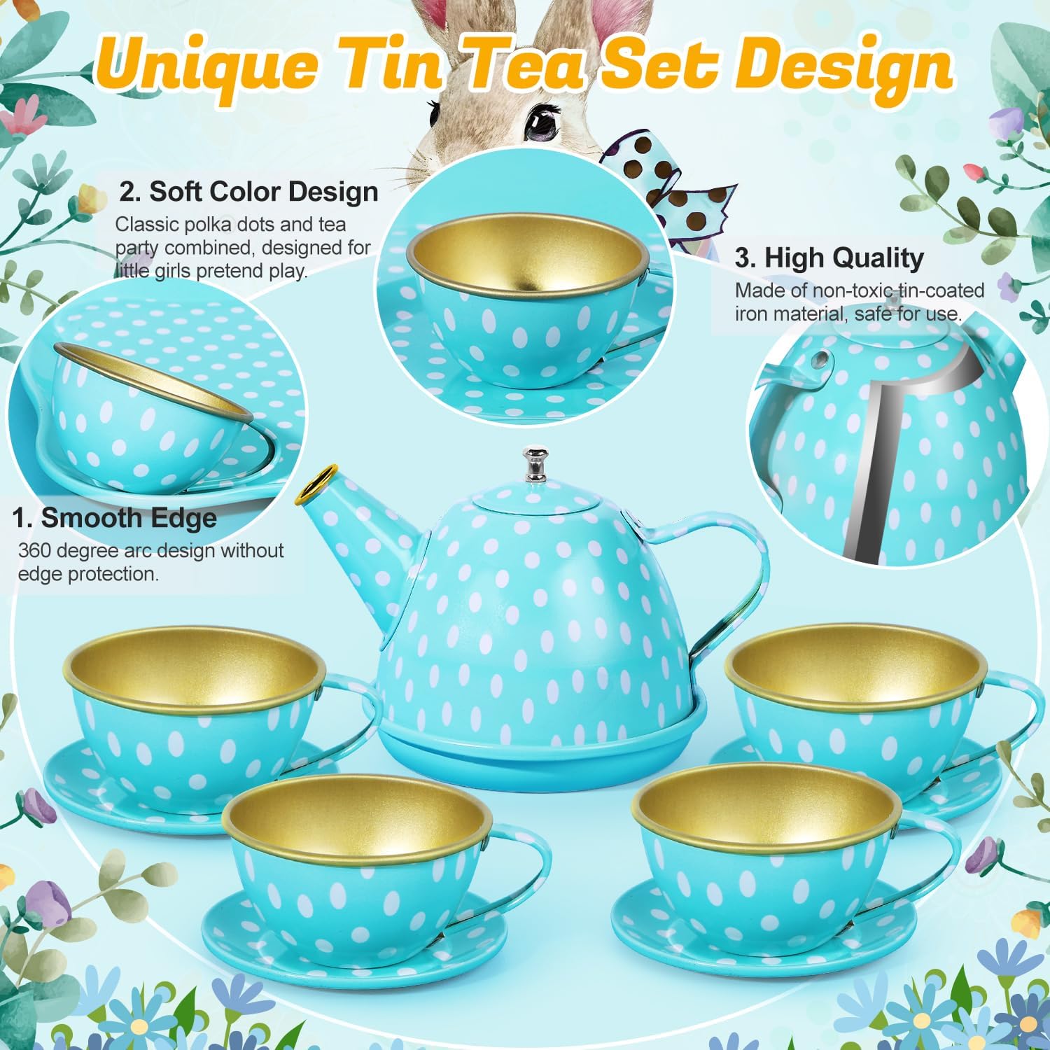 ??【SAFETY TEA PLAYSET】This tea set for girls is made of premium non-toxic and heat resistant tin material, smooth cup mouth for the purpose of protection when playing; dessert accessories providing harmless plastic material, has long-lasting strength and use; the bunny carrying case with alloy handle for easy carry, which toddlers could bring the playset out for camping or other outdoor activities.