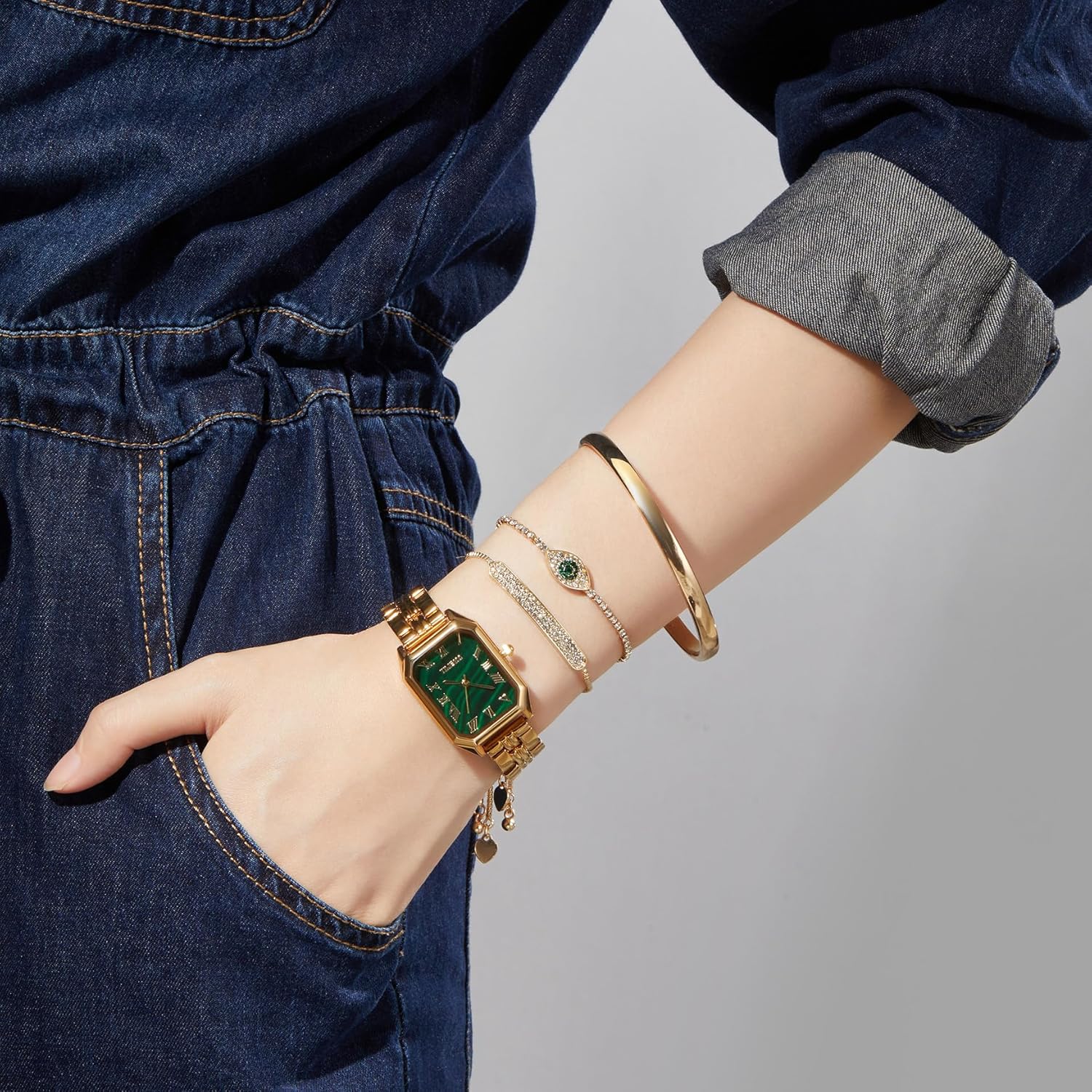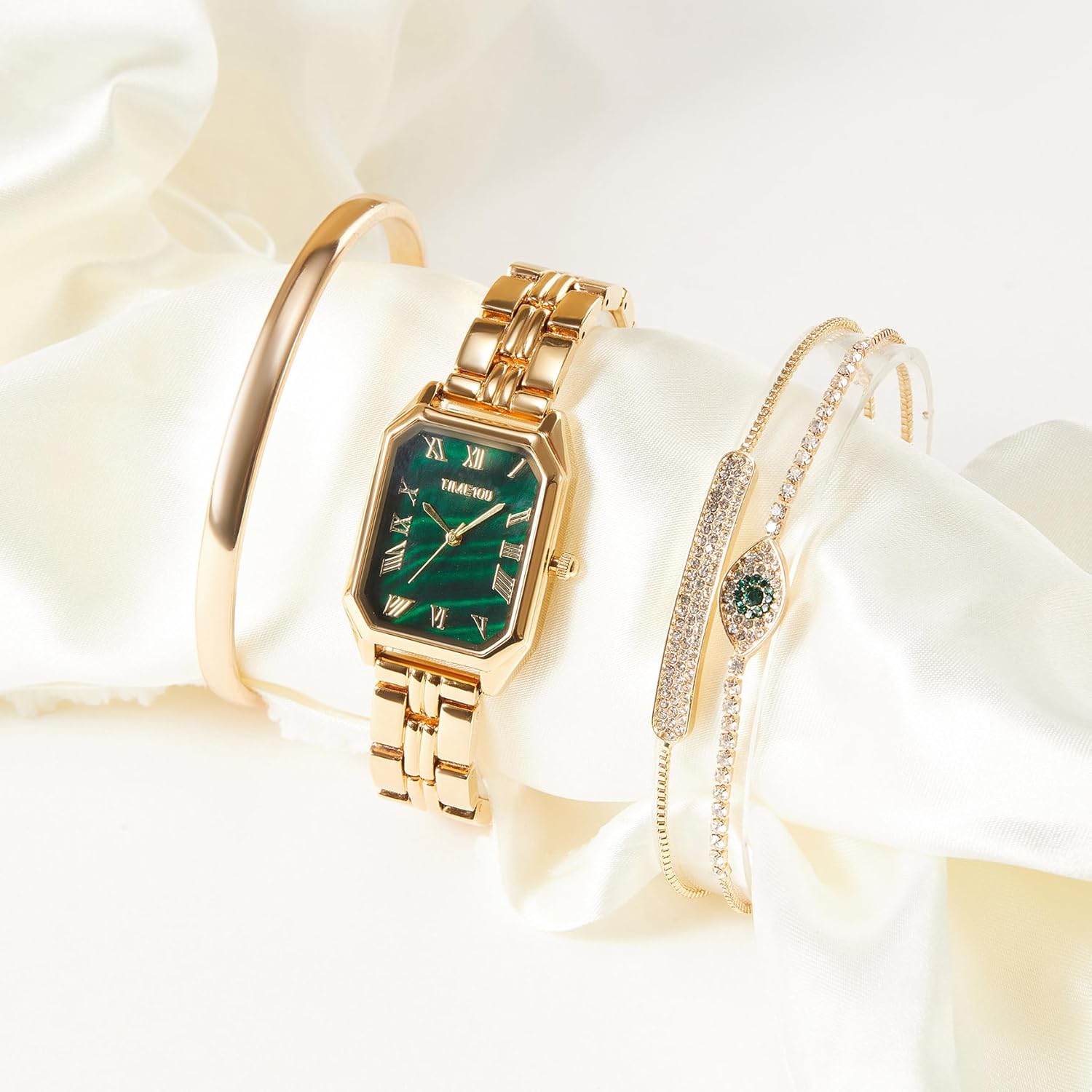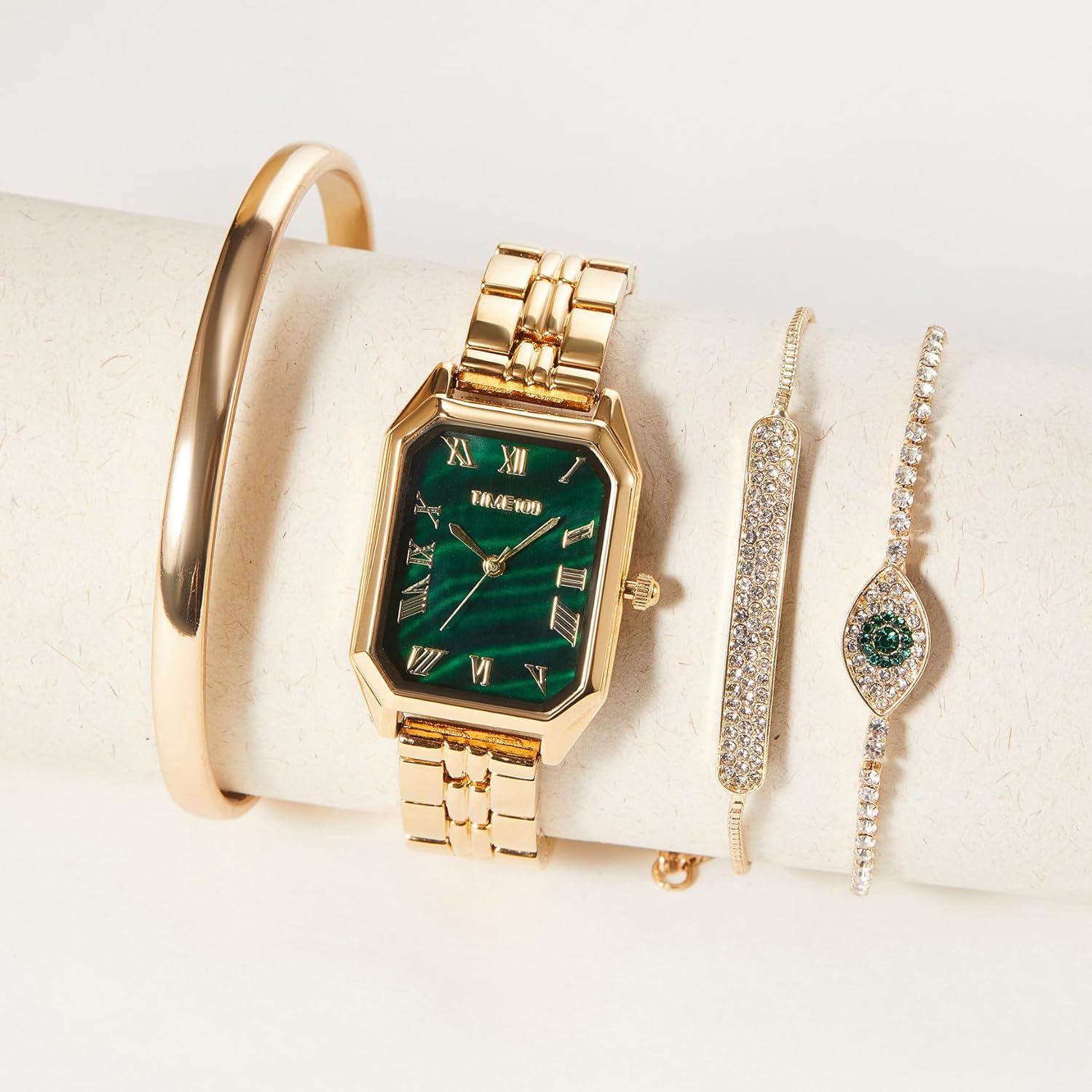Rectangle watch featuring green glossy dial with hands and markers