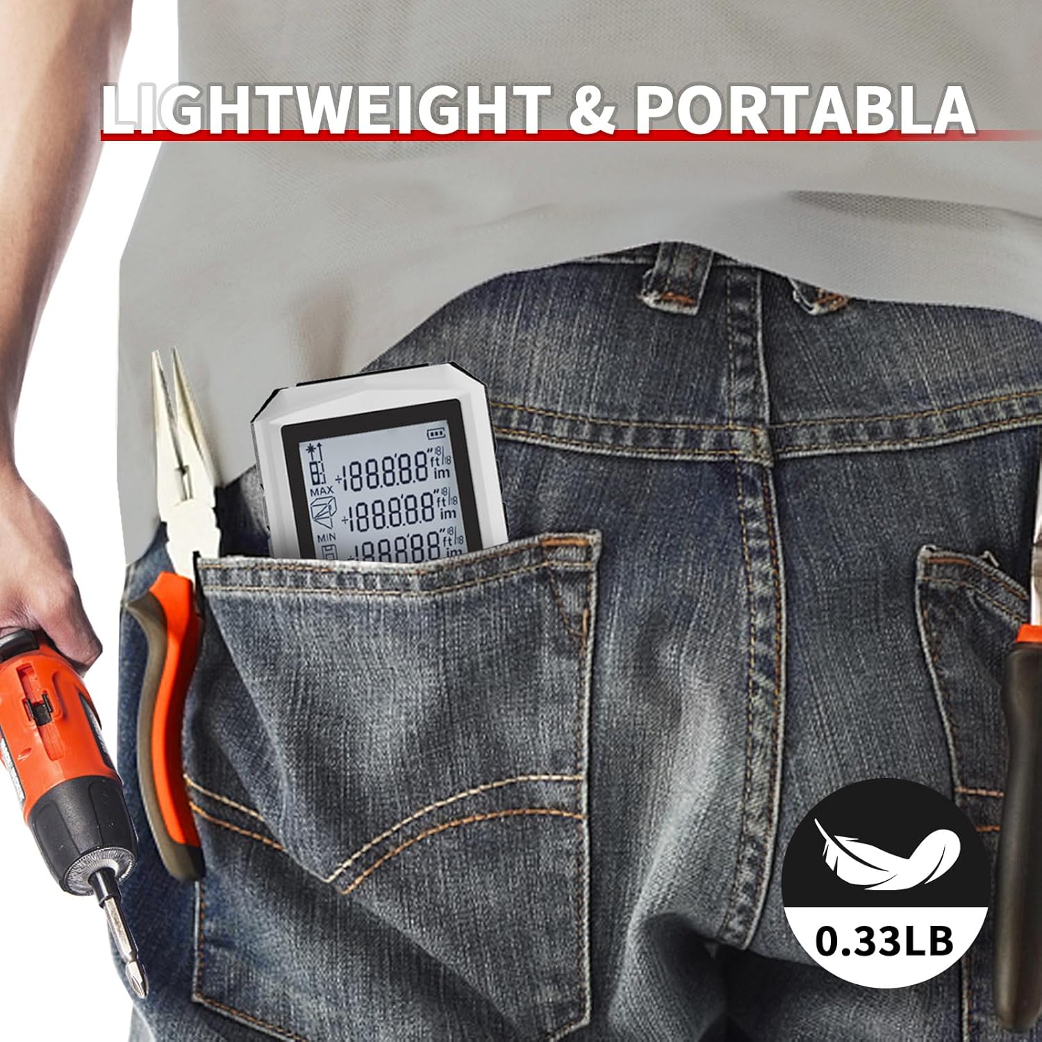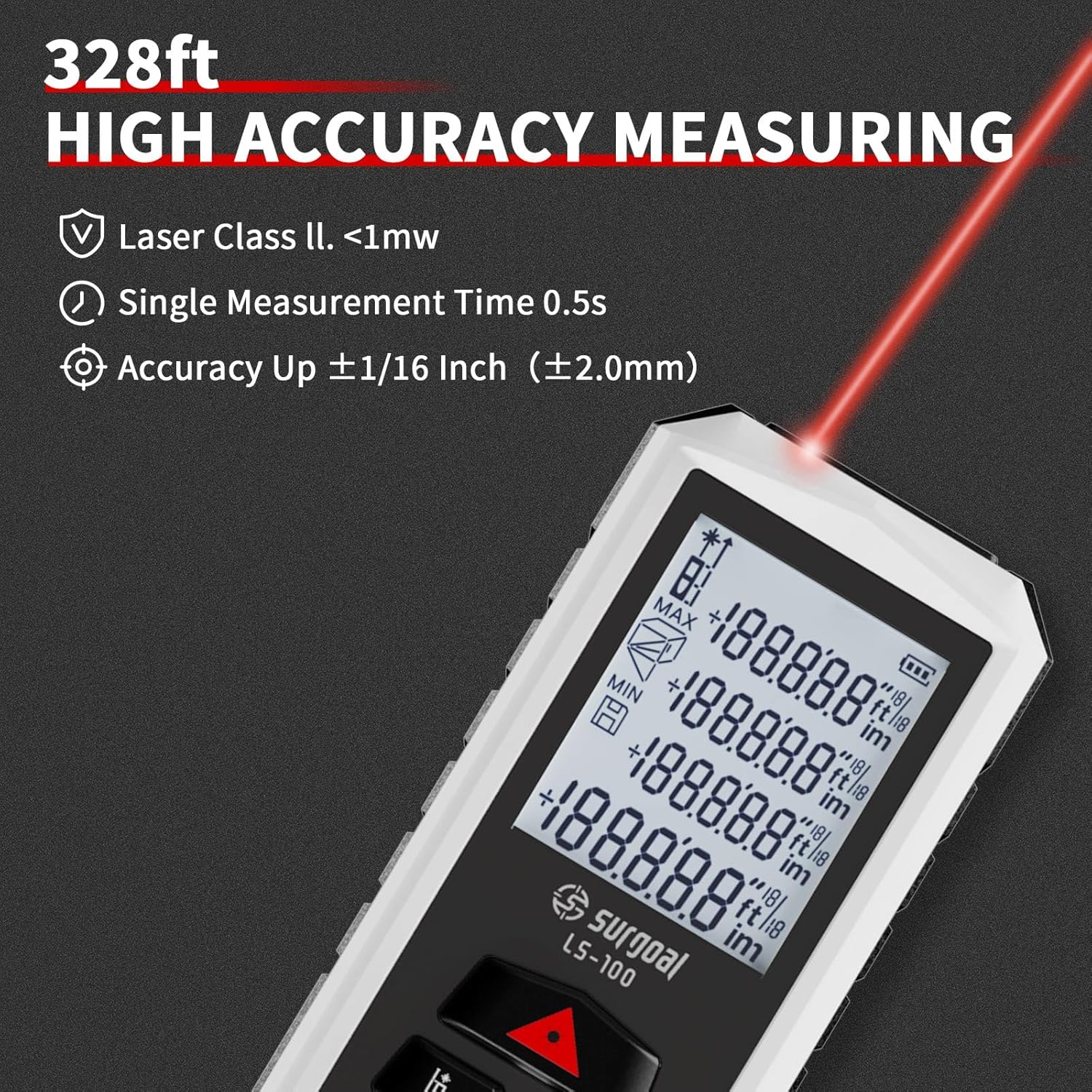 【High Accuracy & Fast Response】Measures distances up to 328ft (100m) with ±2.0mm precision and a fast 0.5-second response time. Equipped with a Class II laser (500–690nm, <1mW), perfect for precise and reliable measurements in any setting.