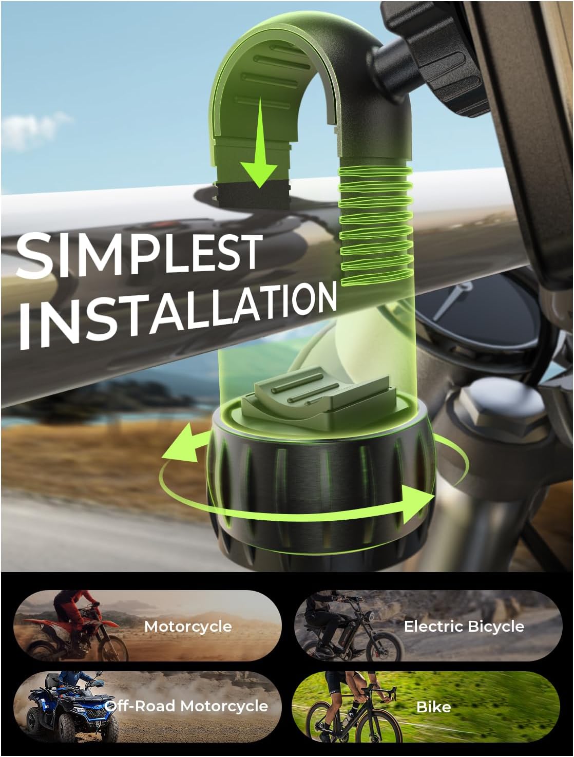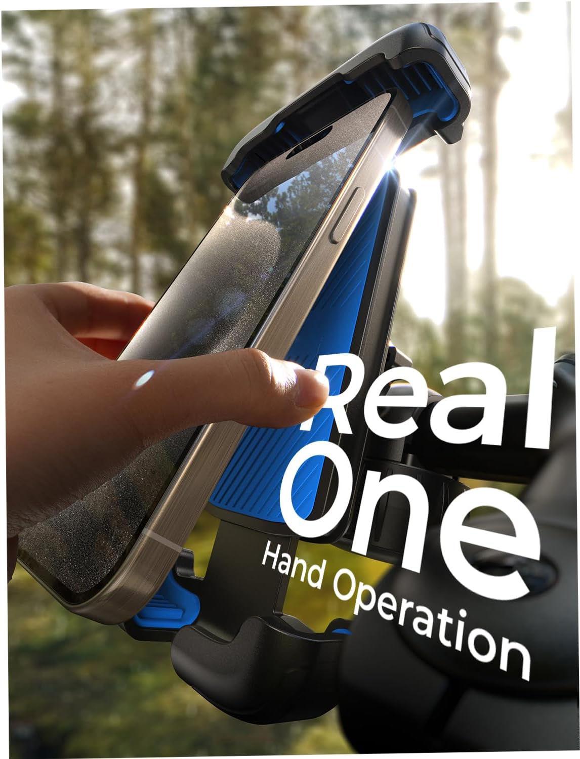 [Ultra-Secure for Your Phone] With our uniquely designed bike phone mount, whether navigating bumpy roads or high-speed roads, your phone remains securely fastened to your handlebar. Its innovative shape firmly secures each corner of your phone, providing excellent stability. What's more, our bike phone holder features a robust locking mechanism. Just focusing on riding. Your phone is safe and accessible at all times.