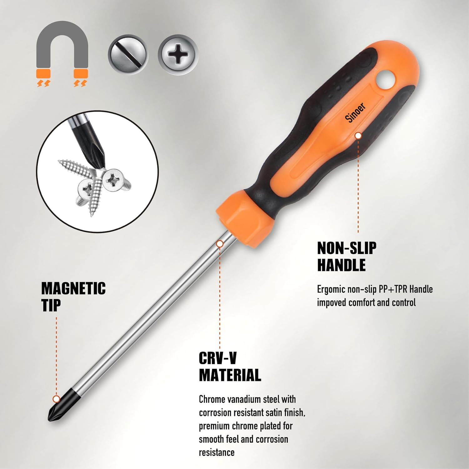Premium material:Magnetic screwdriver set is made of premium materials chromium molybdenum vanadium steel, for enhanced durability, rust resistant and anti-corrosion. it is corrosion-resistant and beautiful.Ergonomic non slip and soft handle, made of PP + TPR.