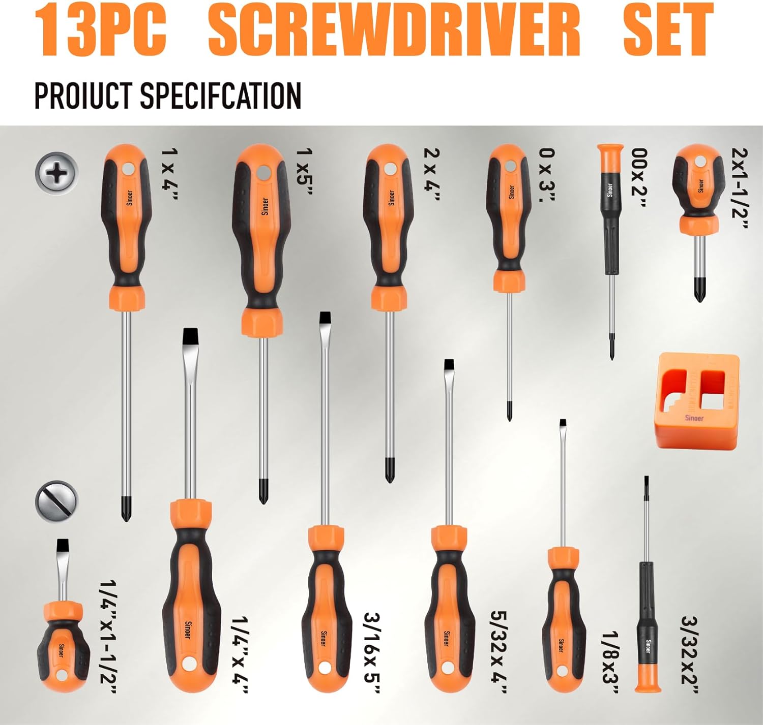 Professional grade screwdrivers: Flat:1/8"x 3",5/32"x 4" ,3/16"x 5",1/4"x 4", 1/4"x 1-1/2",3/32"x2" phillips:#00x2", #0 x 3", #1 x 4", #1 x5", #2 x 4", #2 x 1-1/2".1PC magnetize demagnetize
