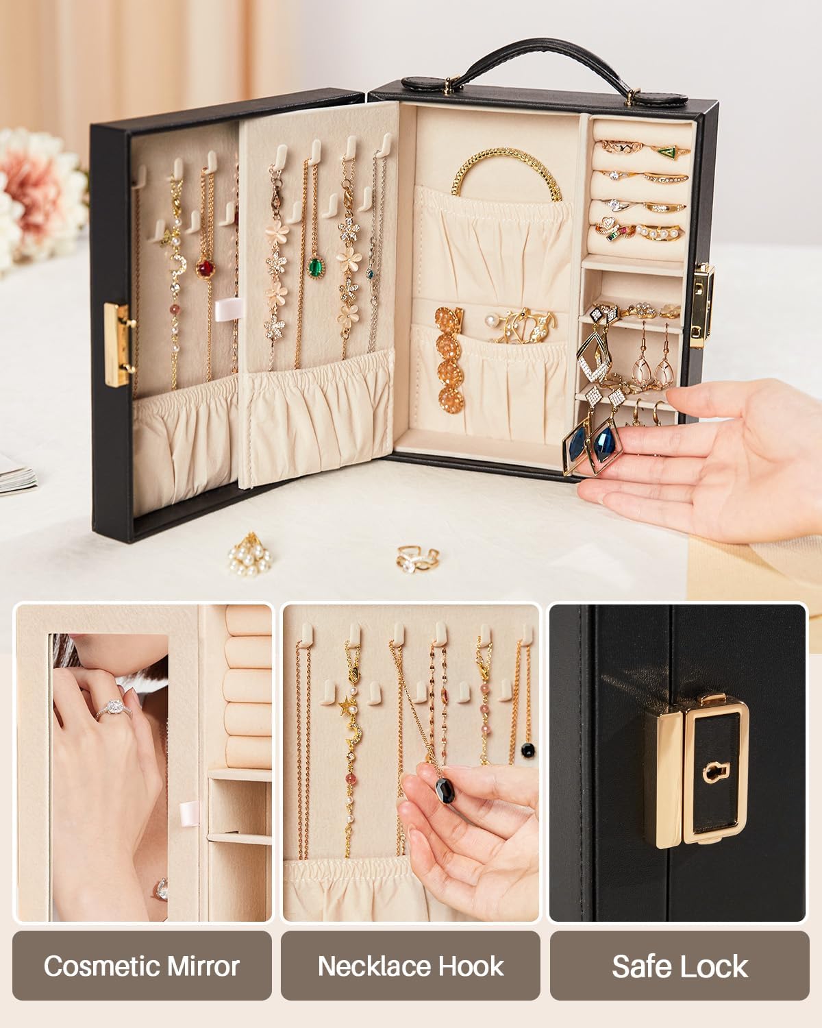 No Need to Compromise on Your Jewelry Selection, as the Large Travel Jewelry Organizer Allows You to Bring a Substantial Amount of Jewelry: This three-layer jewelry organizer offers ample storage space, allowing you to pack plenty of jewelry for your journey. The first layer includes 11 necklace hooks, capable or holding at least 11 necklaces. The second layer features a mirror on the left side for you to dress up, and 7 necklace hooks on the right side. The third layer contains 2 bracelet pouches, 2 removable earring cards, and 4 rows for rings, accommodating watches, bracelets, bangles, earrings, ear studs, rings, hair clips, hair ties, etc.