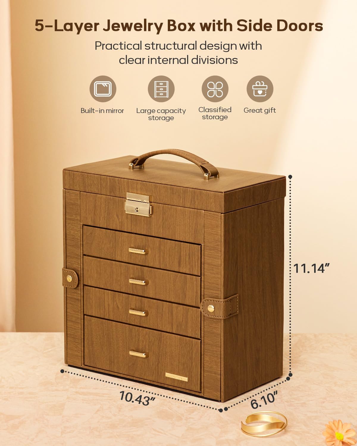 Large Jewelry Box: This 5-layer, 4-drawer jewelry box has dimensions of 11.14’’ x 10.43’’ x 6.10’’. It has a large capacity and can store a variety of different-shaped jewelry accessories such as watches, necklaces, earrings, bracelets, hairpins and brooches