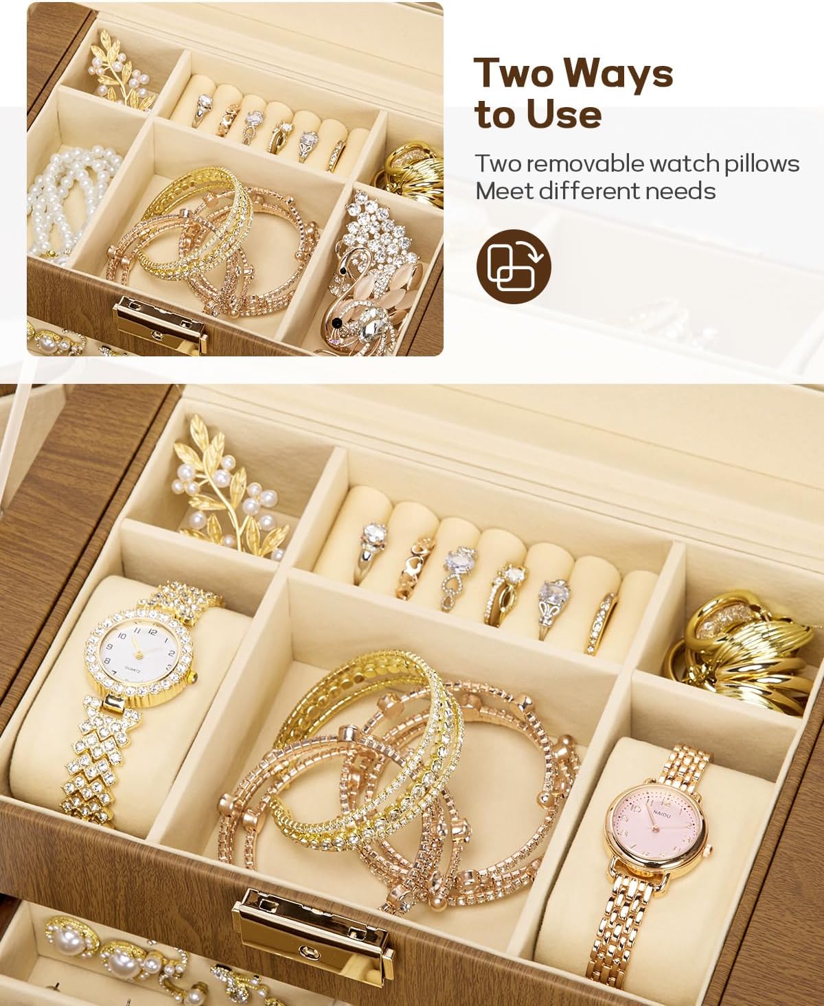 Jewelry Box and Watch Case and Necklace Organizer: The top layer has 2 soft watch pillows where you can store your watches and bracelets. By removing the watch pillows, you can store more jewelry. And there are a total of 16 necklace hooks and 2 storage bags on the side to store necklaces and prevent tangling