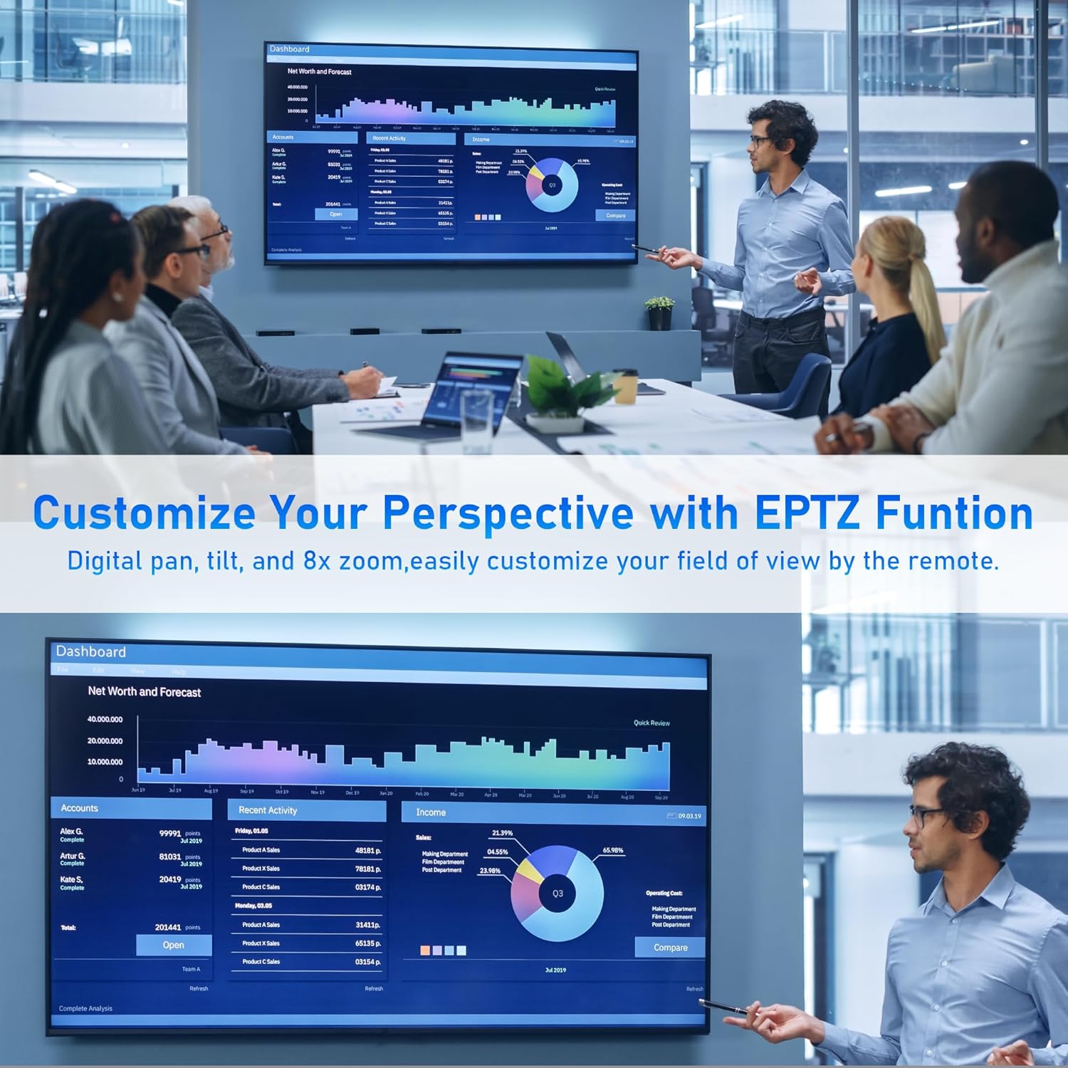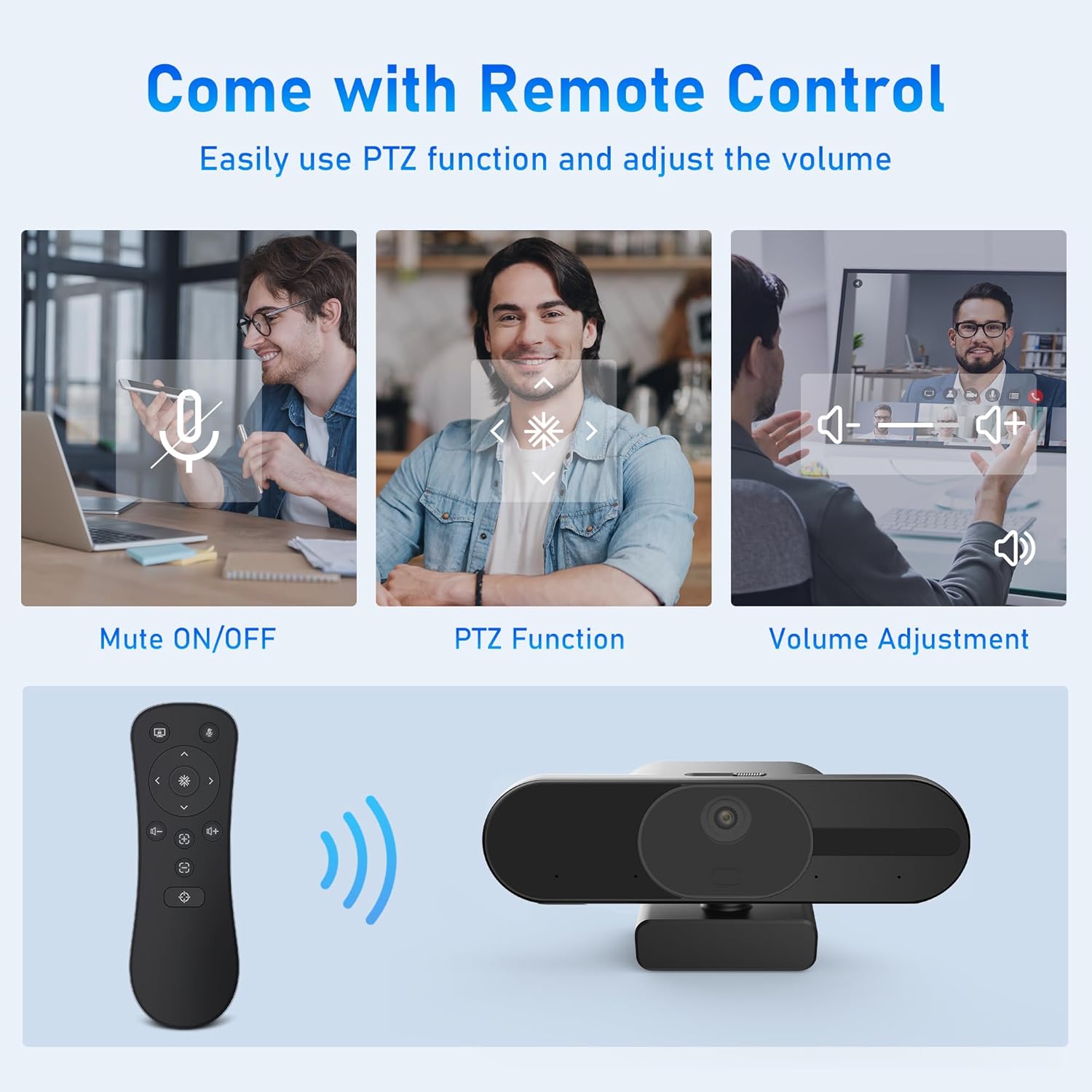 With Remote Control & ePTZ Function ---- The V21 computer camera supports remote control, allowing you to customize your viewing field with its digital pan, tilt and 8X zoom. The remote also features one-touch controls to restore the view, freeze video, mute, adjust manual focus, and control the volume. With 120° wide angle, this usb camera for computer can provide a wider view.
