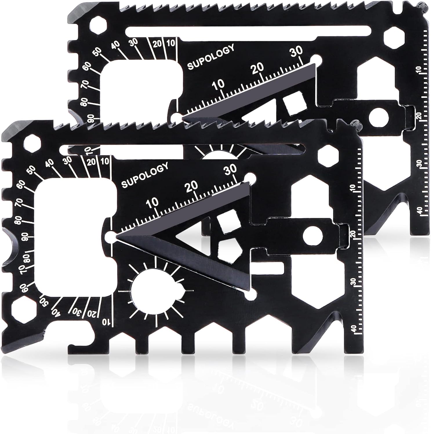 Multitools Wallet Cards: Bike Spoke Wrench, BBQ Scraper, Can Opener, Box Opener, 3/16" Wrench, Flathead Screwdriver, Pencil Curved Cutter, Double-sided Saw, Phillips Screwdriver, Ruler, Cord Cutter, Hexagonal Series Wrench, Hex Driver, Direction Auxillary Indication
