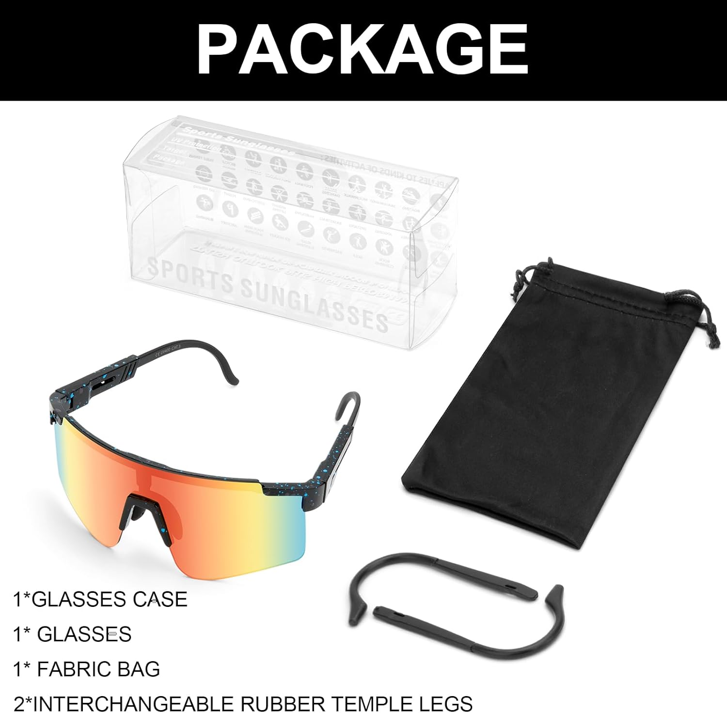 【WHAT YOU GET】1 cycling glasses, 1 fabric bag, 2 interchangeable temple legs, our prompt responding within 24 hours and 100 percent satisfactory after-sales services.