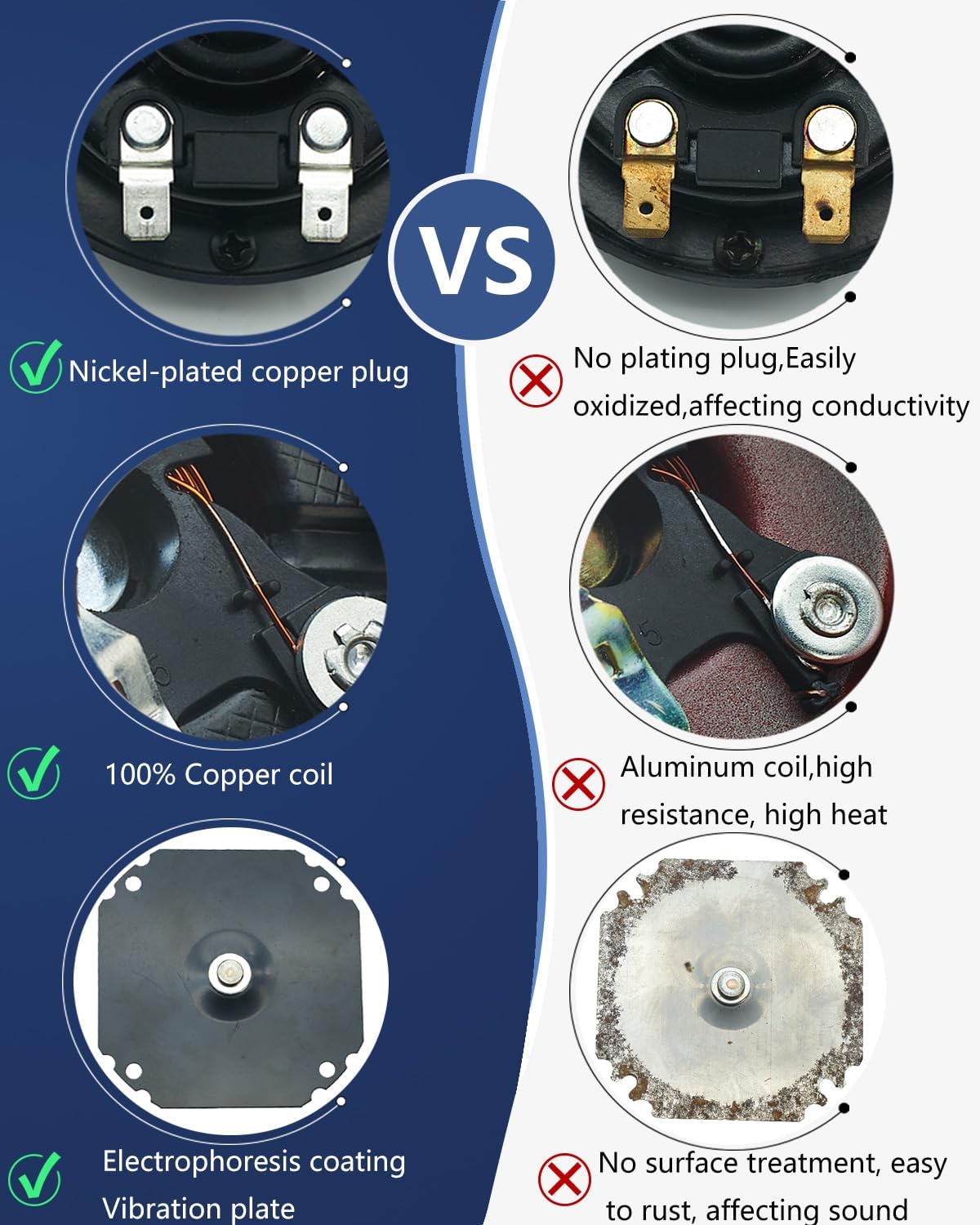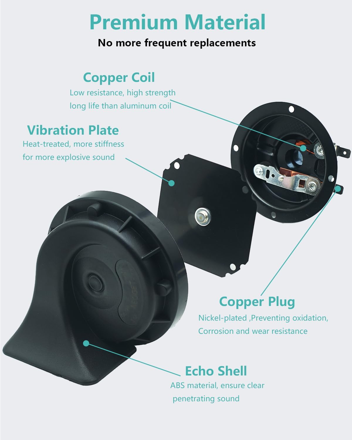 Quality Material: The 12v horn is powered by copper coil, which is good conductivity for low heat, ensure stable sound and long lifespan, no more frequent replacement