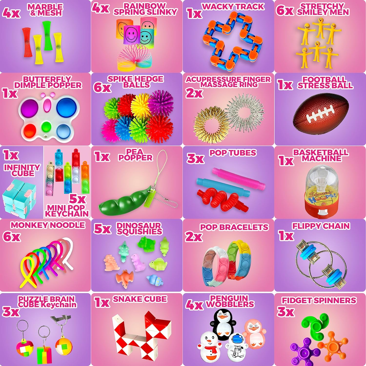 【SET OF 120】4 Poppers, 2 Squishy Balls, 2 Stress Balls, 4 Sticky Hands, 4 Spinners, 1 Infinity Cube, 2 Sensory Rings, 1 Flippy Chain, 5 Dino Squishies, 2 Pop Bracelets, 10 Slimes, 1 Snake Cube, 6 Monkey Noodles, 1 Unicorn Pop Purse, 1 Dimple, 1 Pea Popper, 4 Springs, 1 Wacky Track, 3 Puzzle Cubes, 6 Stretchies, 6 Spike Balls, 4 Marble&Meshs, 1 Rubik, 1 Maze Puzzle, 1 Basketball Machine, 4 Penguin Wobblers, 3 Pop Tubes, 8 Pop Rings, 1 Controller Pad, 5 Keychains, 25 Building Blocks