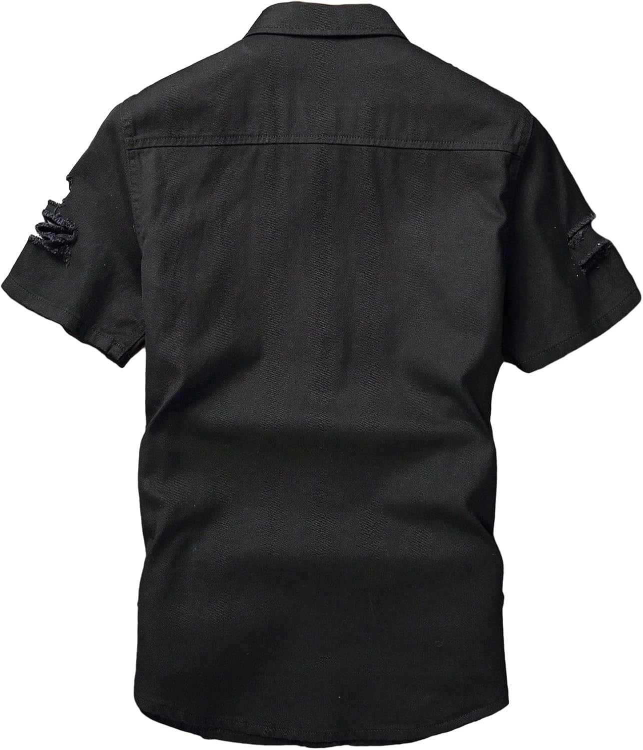 Feature: Dark grey, ripped, button front, short sleeve denim shirt