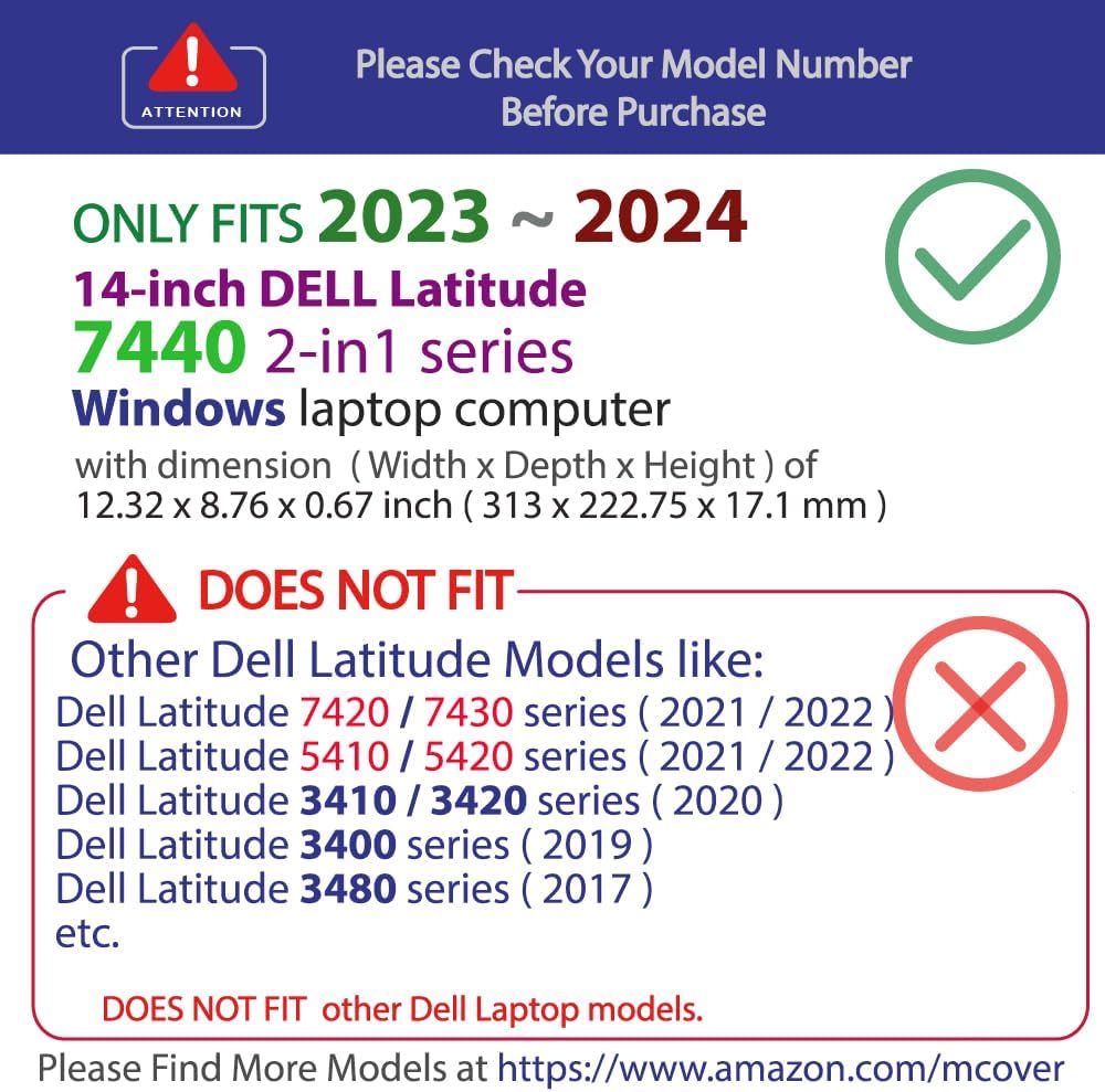 Designed to perfectly fit the 2023~2024 14" Dell Latitude 7440 Windows Laptop with dimension of 12.32 x 8.76 x 0.67 inch ( 313 x 222.75 x 17.1 mm )