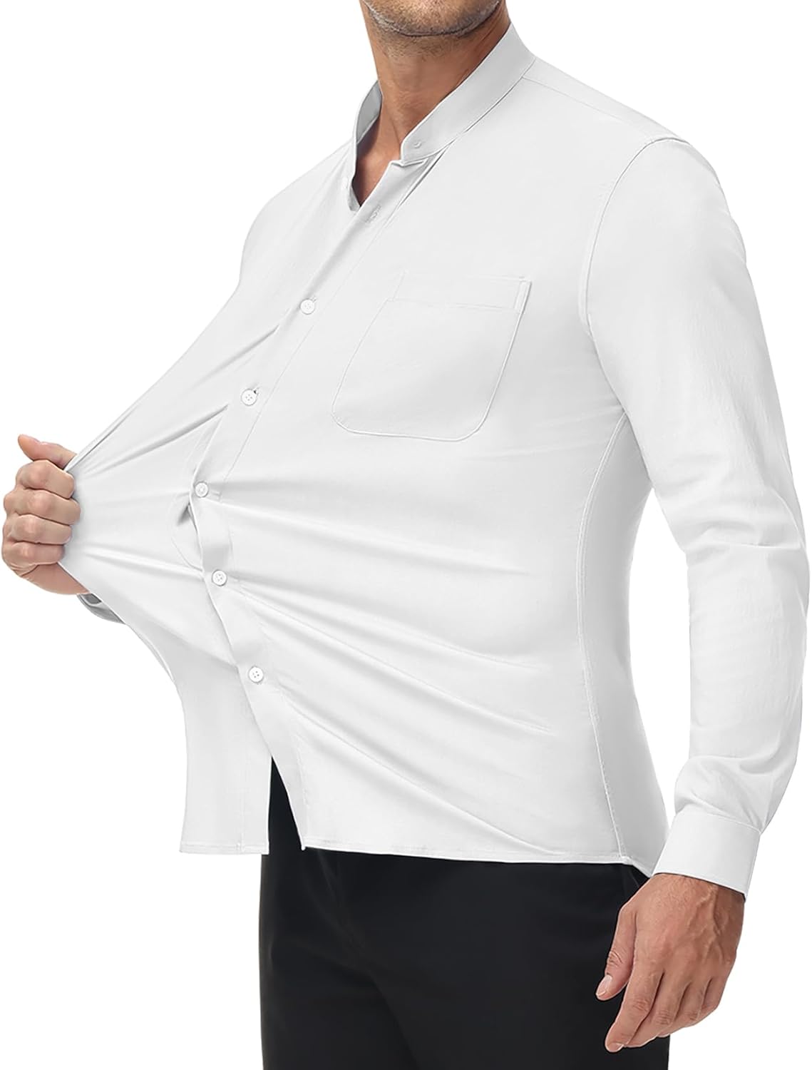 Highly Stretch Mens Dress Shirts: The collarless dress shirts for men made of performance flex material, rich in elastic fibers, and be comfortable and soft. That allows them to covering your body easily and freedom of movement