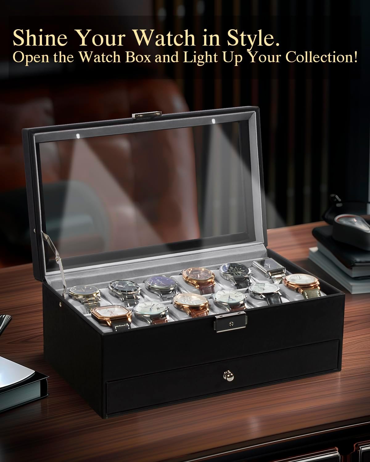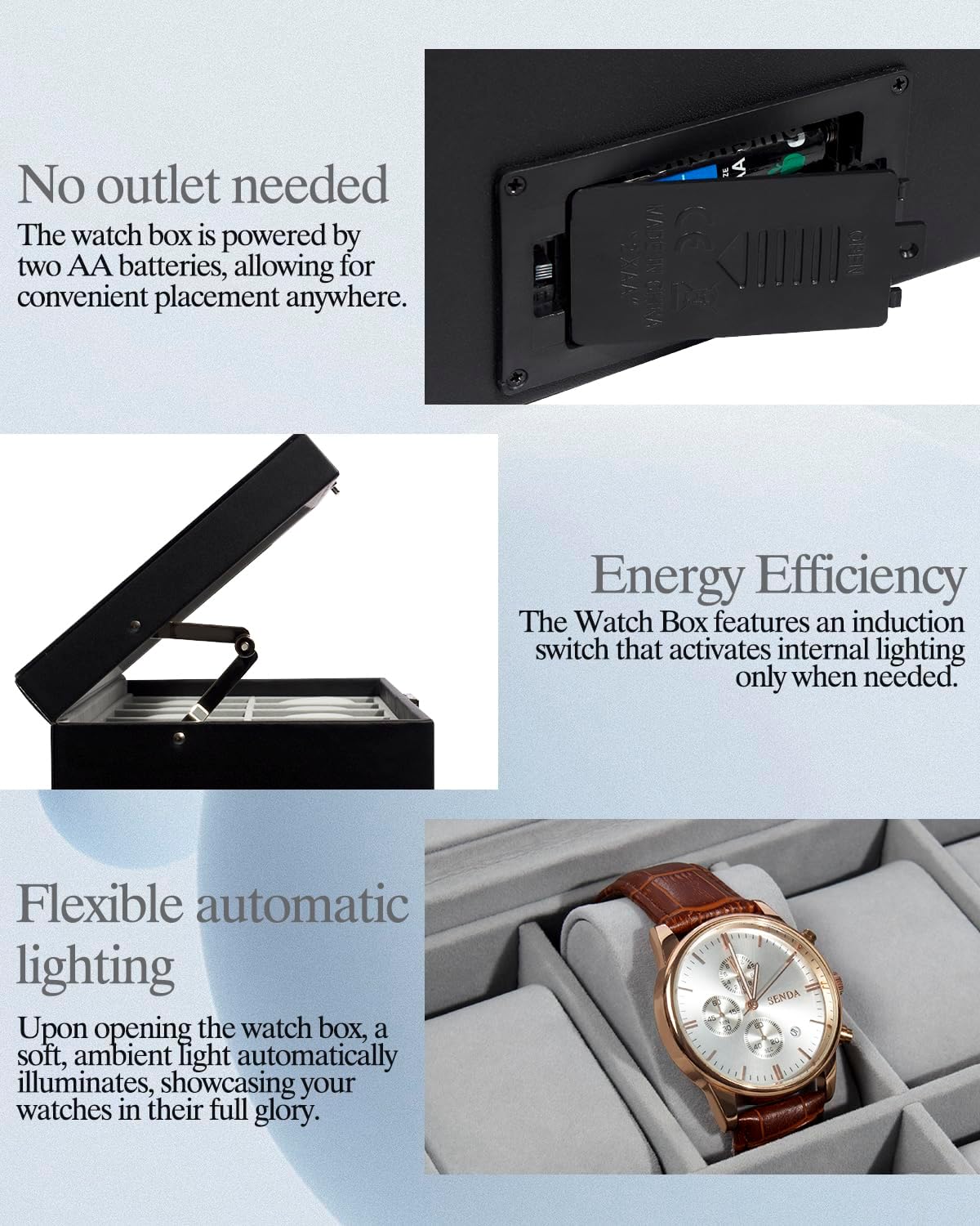 [???????????? ????????????????????]: When you open the box, a soft, ambient light illuminates your watches, making it easy to select one even in dim environments. This automatic lighting provides convenience and elegance while conserving energy by turning off when the box is close.