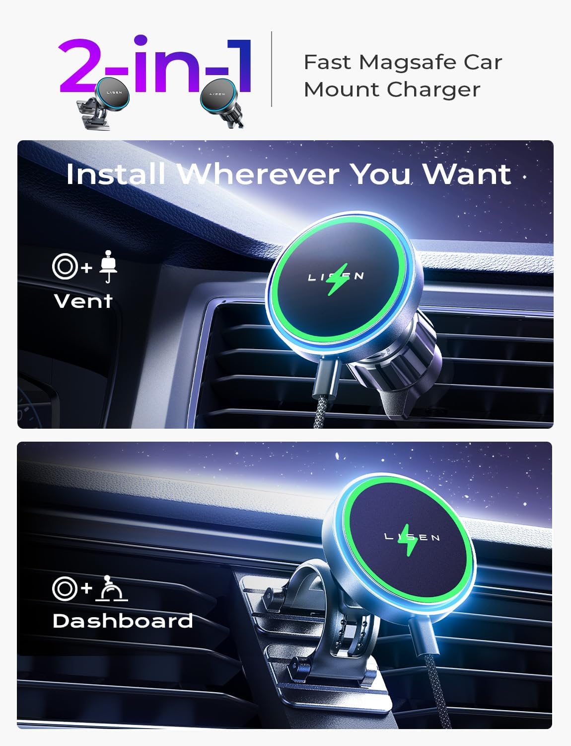 LISEN for 15W MagSafe Car Mount Charger,Magnetic Wireless Car Charger for iPhone 16 Pro Max Accessories,Magnetic Phone Hol...