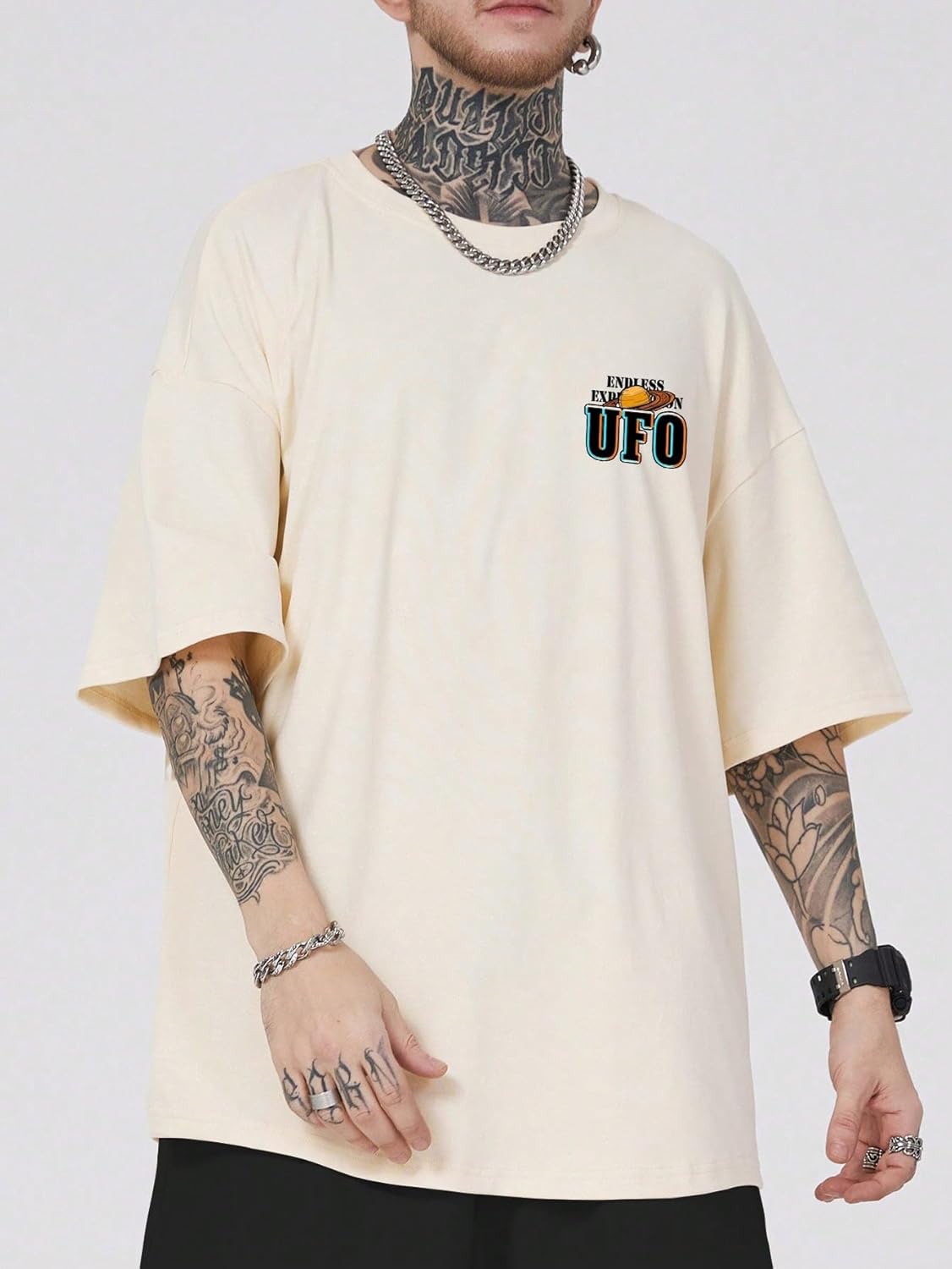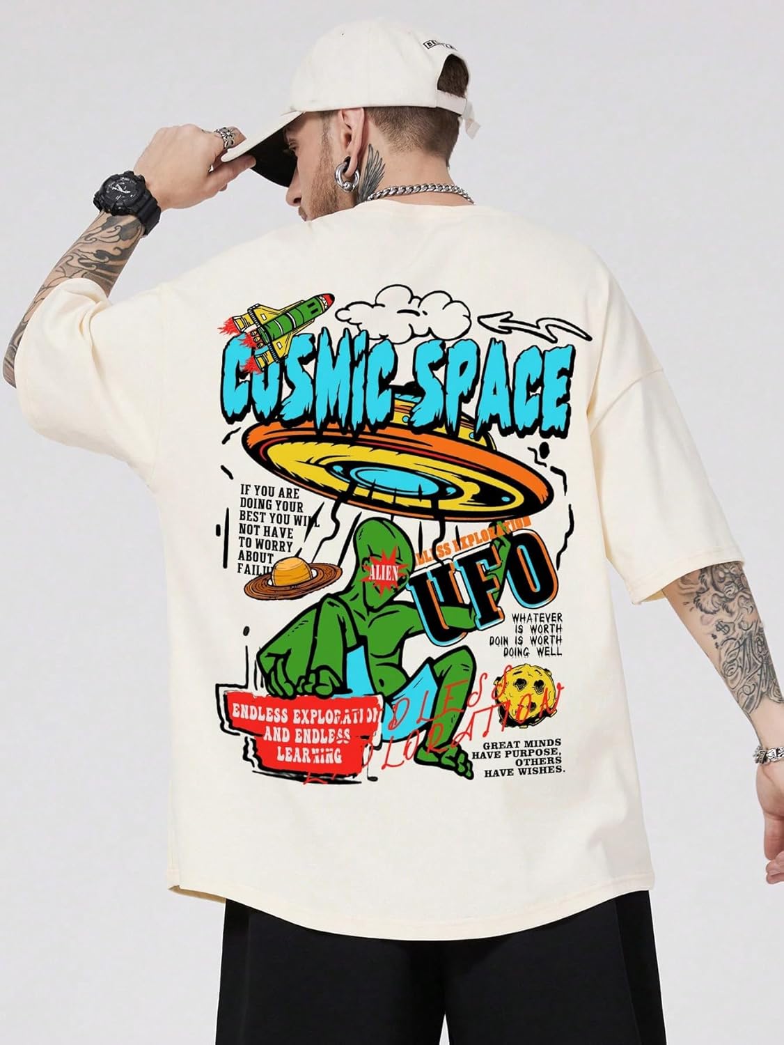 Features: slogan print, drop shoulder, round neck, casual style