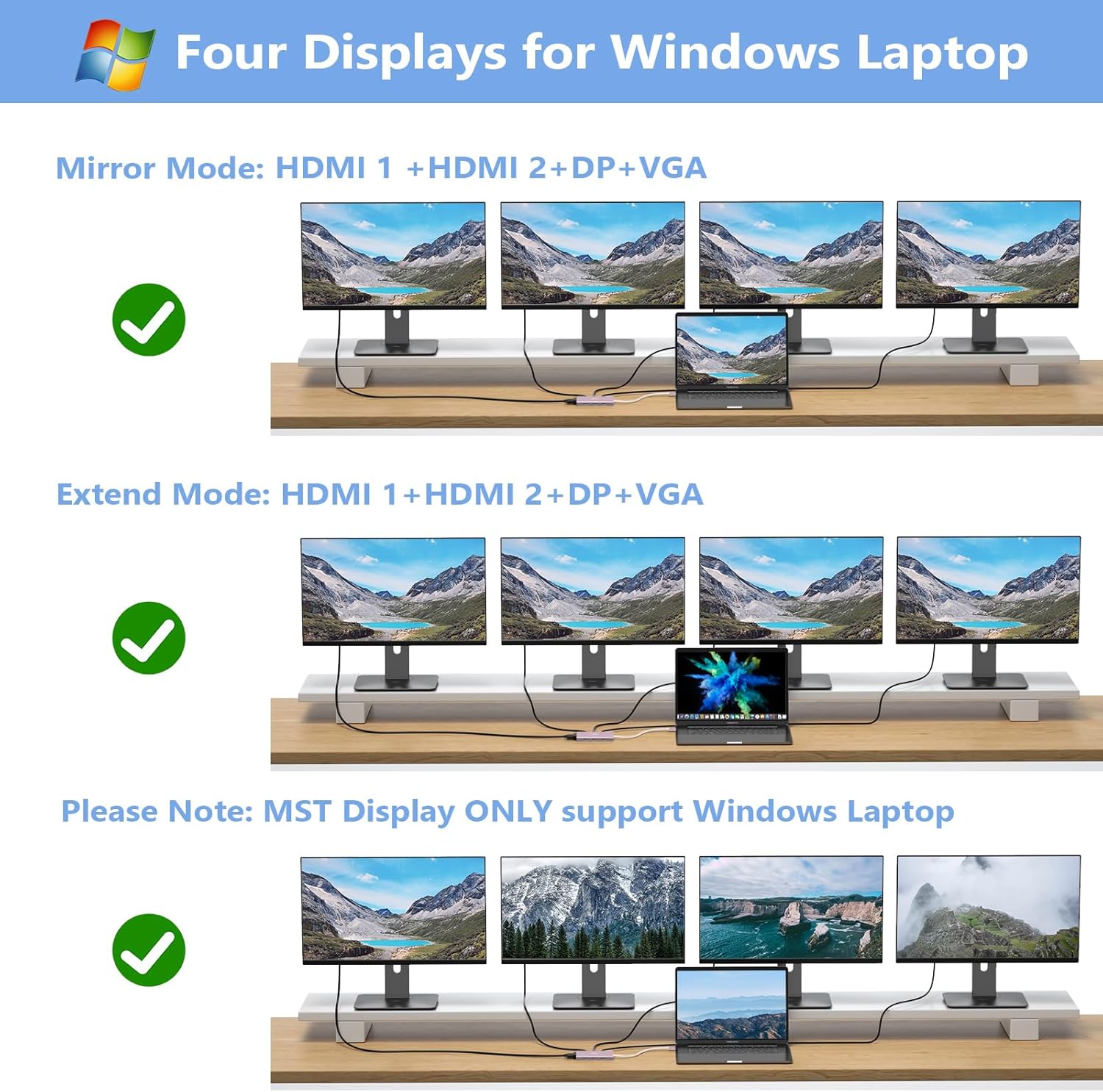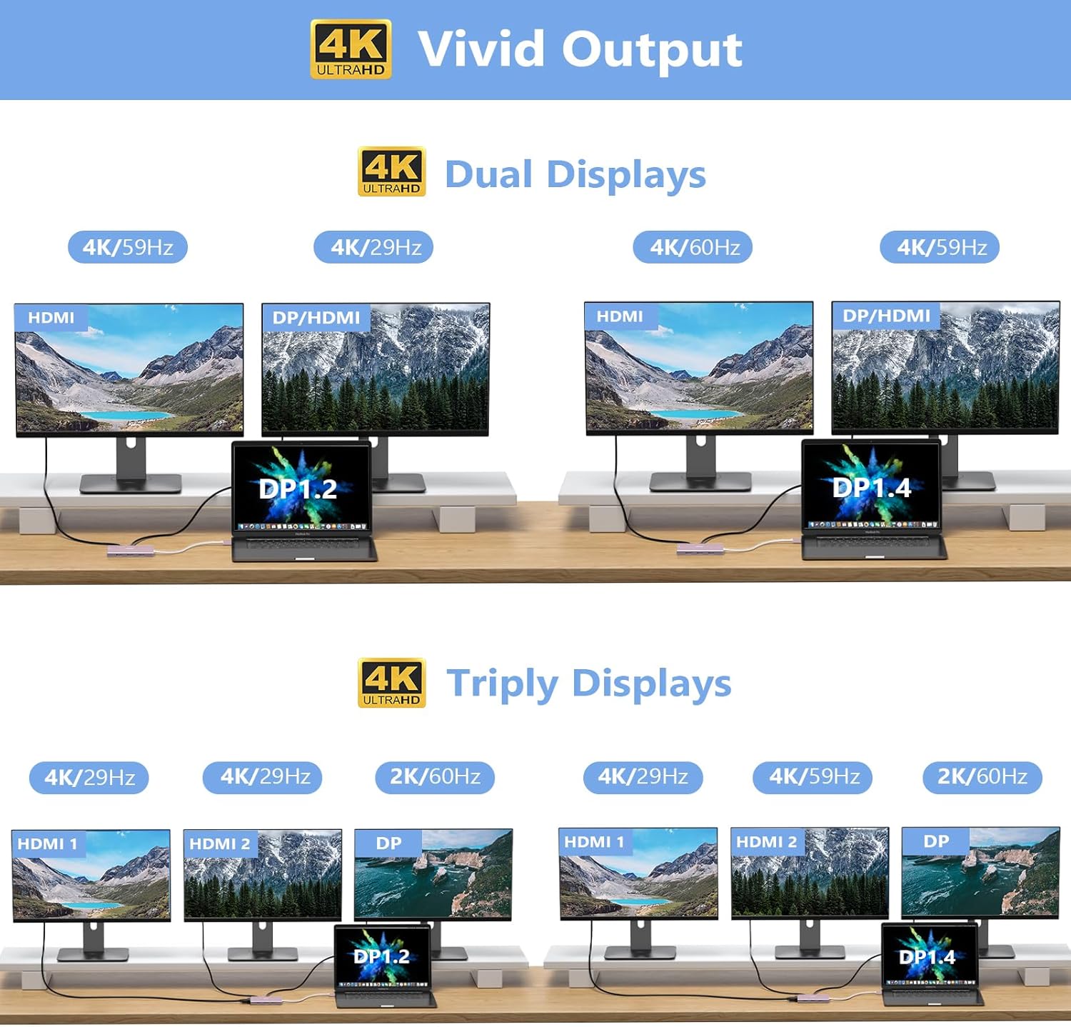 Docking Station 4K Display Adapter: The Laptop Docking Station with 4 video output ports: 2 HDMI+DP+VGA, can output up to 4K Dual/Triple Display videos; For quadruple display Dual HDMI, DP, and VGA all are 1080@60Hz. Please make sure your laptop specification support DP1.4 signal output. If the VGA port is connected, it will affect the resolution of all displays up to 1080P only