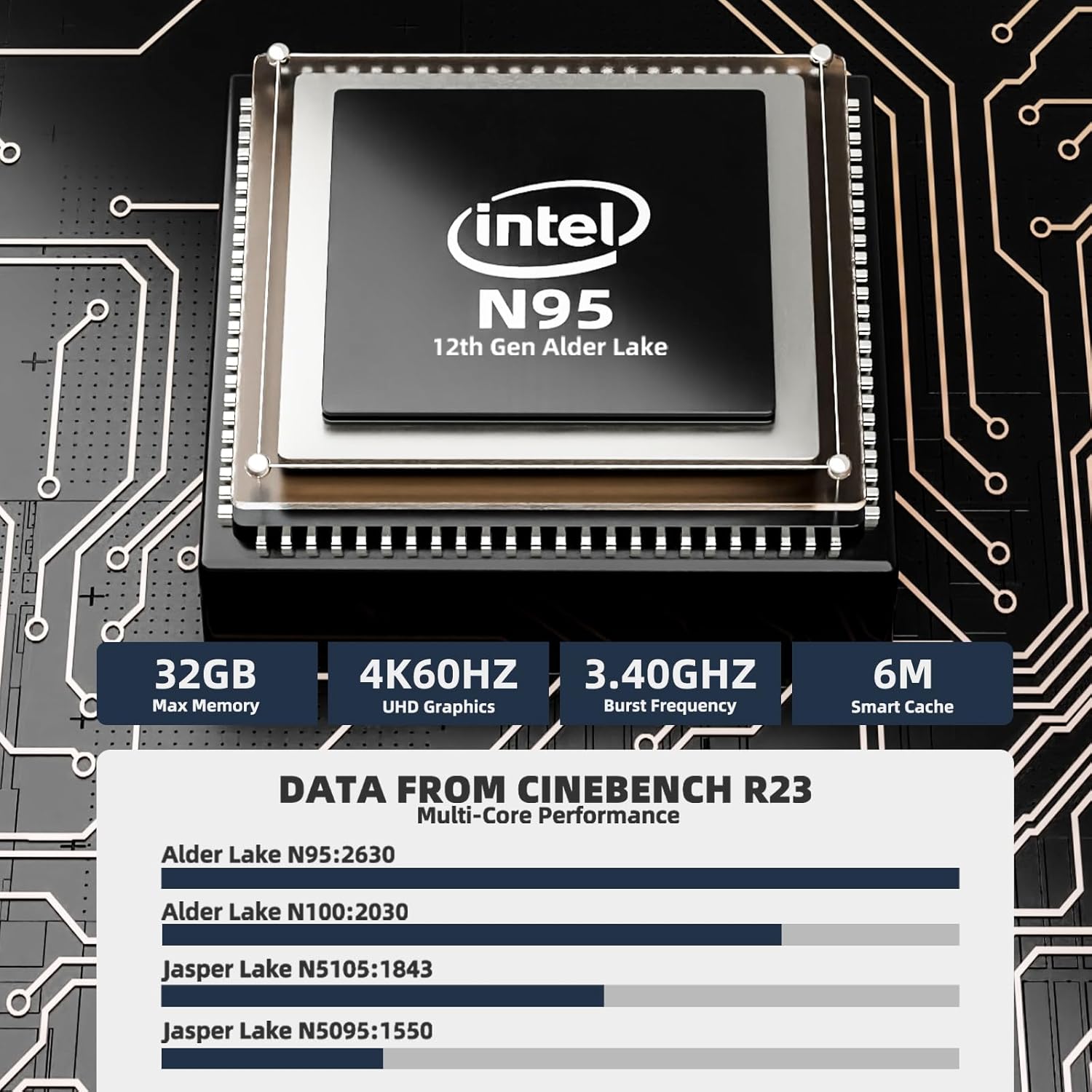 【12th Intel Alder Lake N95】Newest 12th Intel Alder Lake N95 (Up to 3.4GHz) processor. Compared with Intel (N100/N5105/N5100/N5095), N95 CPU performance +35%, GPU +78%.