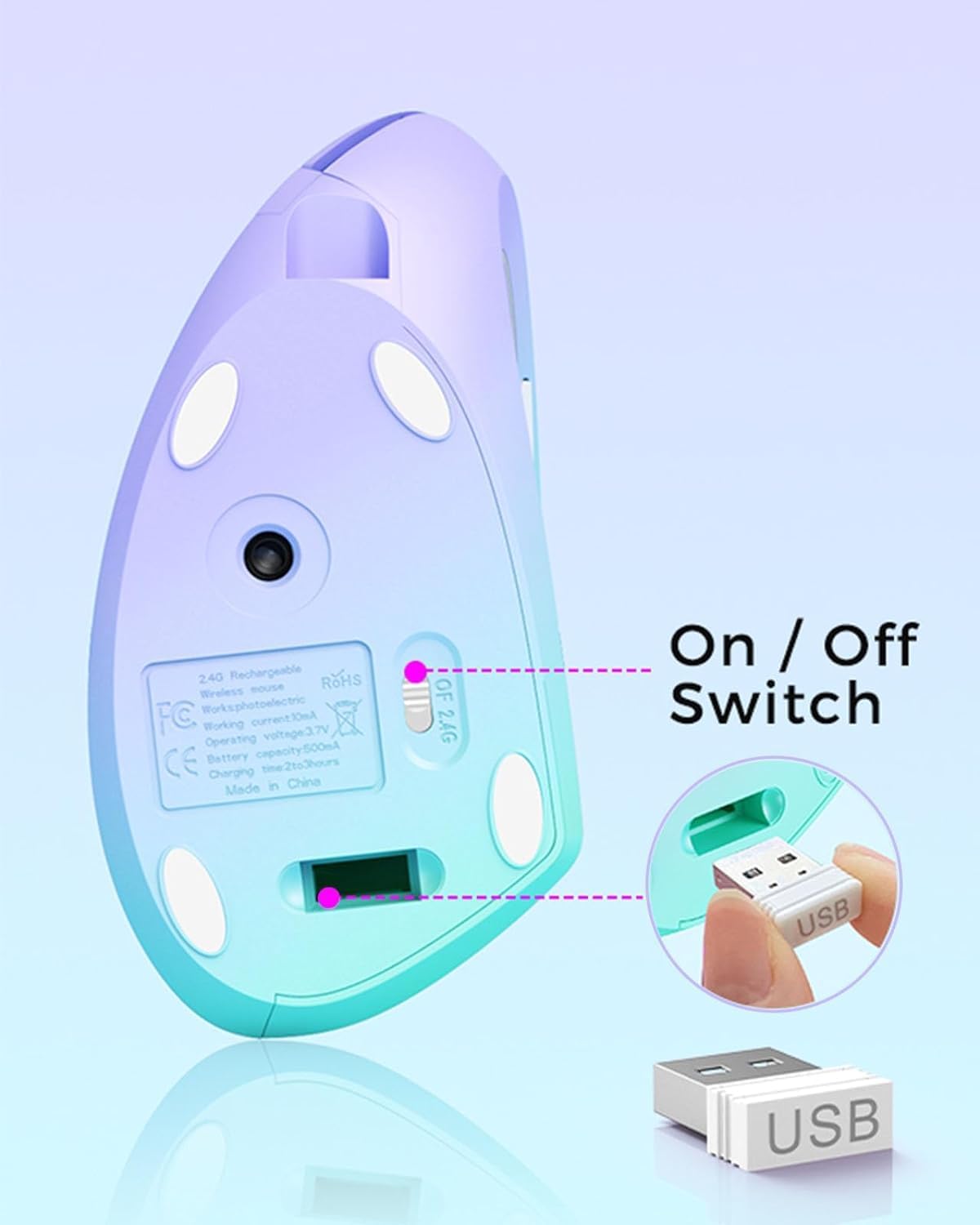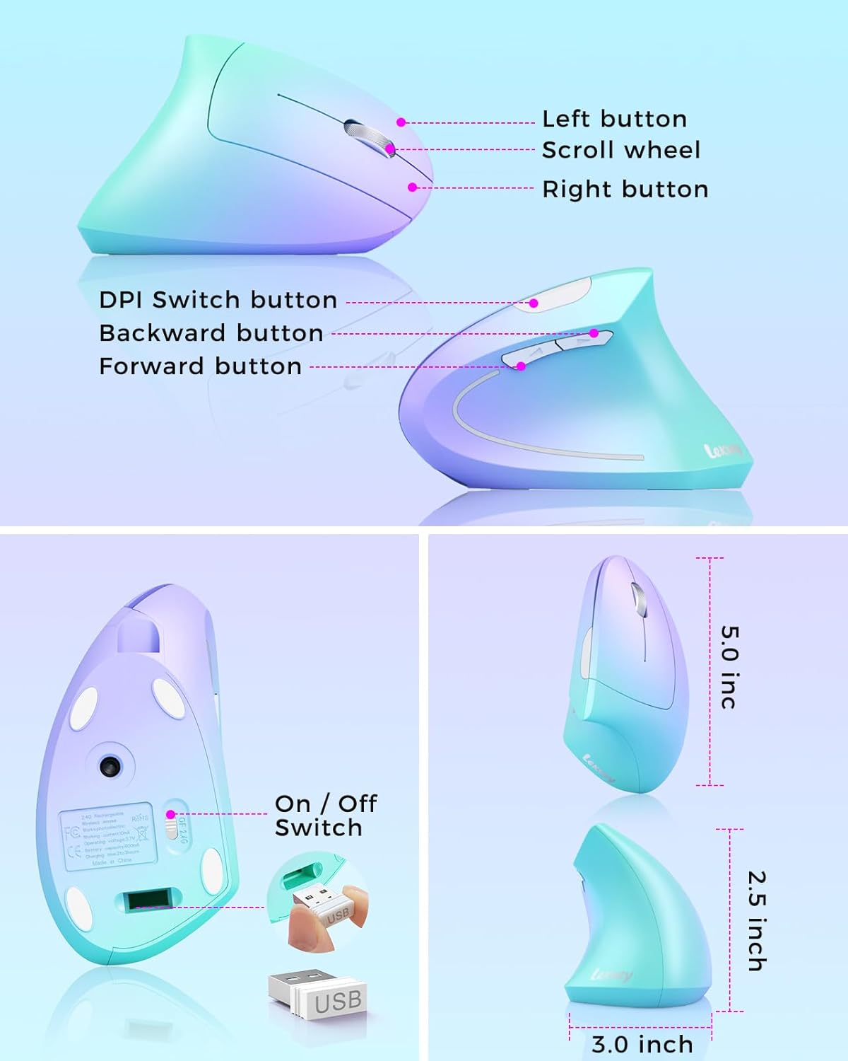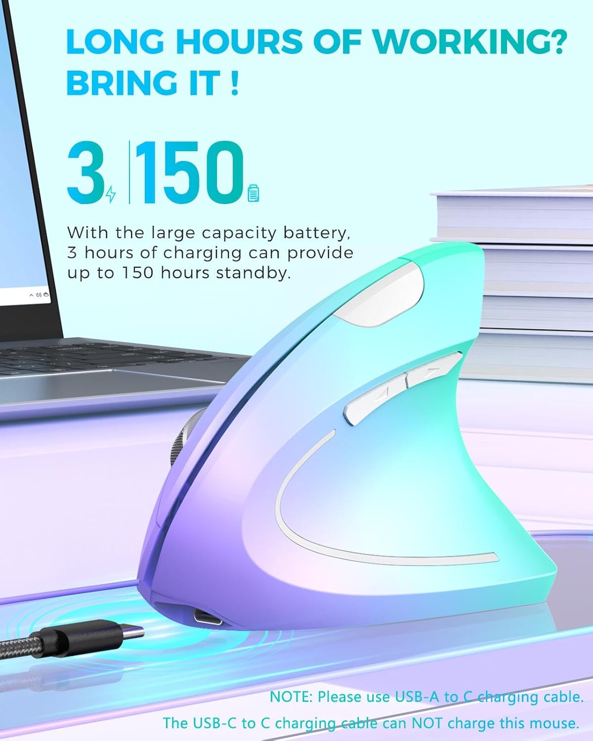 High-Capacity Rechargeable Battery: The wireless ergonomic mouse has a built-in rechargeable battery. You no longer need to buy batteries, it is very convenient !! 3 hours of charging can provide up to 150 hours of use. Easy to Use -- One nano 2.4 GHz USB receiver at the bottom of the vertical wireless mouse, Just Plug and Play! NO Bluetooth