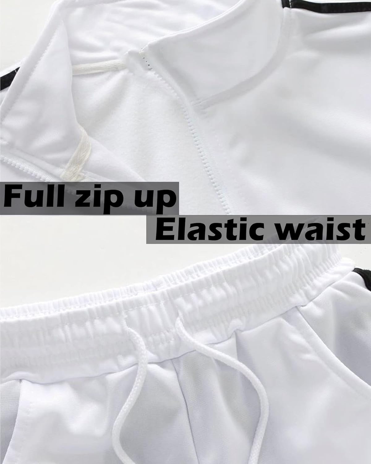 Side pockets on both jacket and pants,convenient for you to bring small things with you,like keys,phone.Full-zip front offers easy on-and-off.
