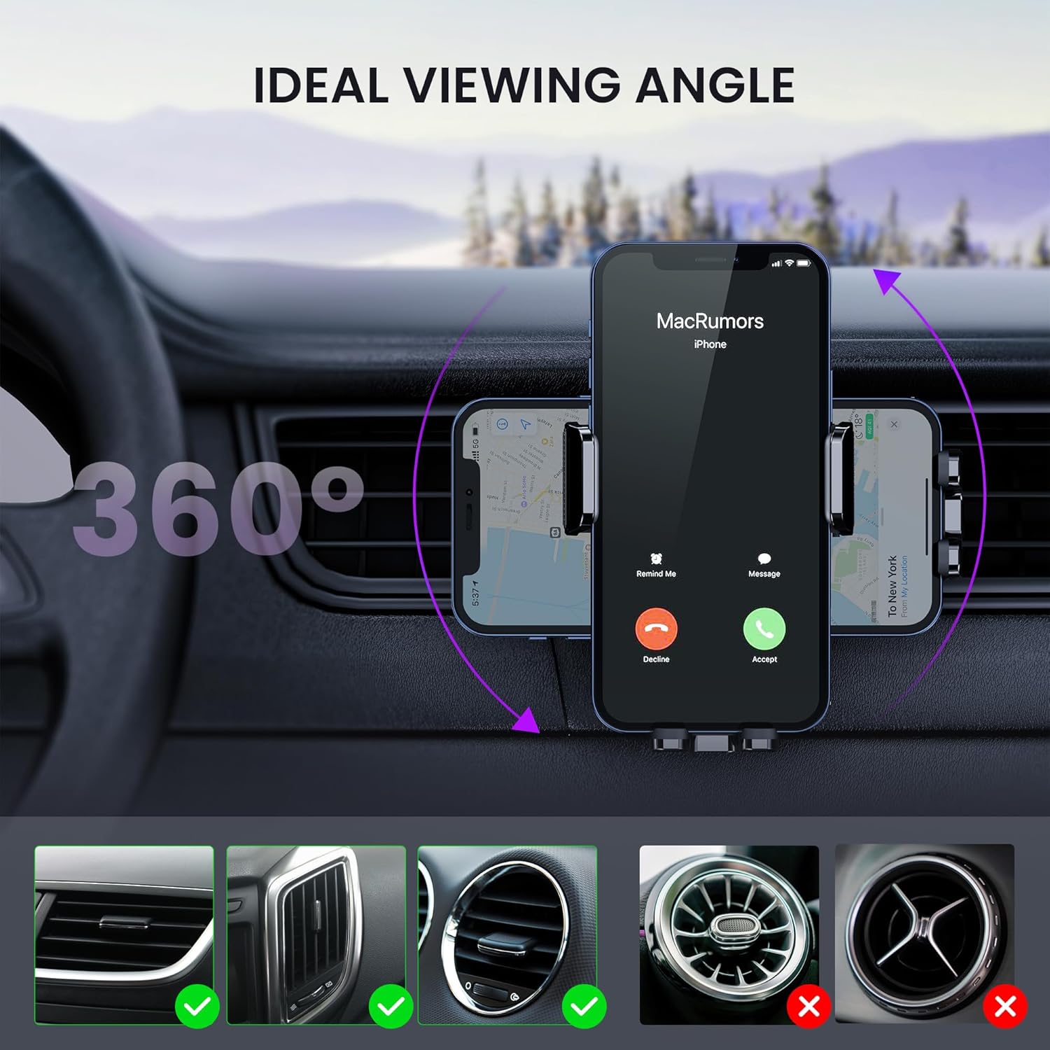 Adjustable Car Mount: With 360° swivel and rotating ball joint, the car holder for i-phone can be easily adjusted to the best viewing angle. The Car Vent Phone Holder keeps you safe wherever and whenever you drive.