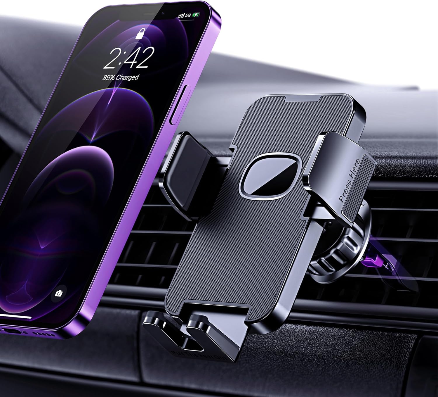 Easy to Install: Clip the car vent phone holder onto the vent and rotate the handle locking ring. The quick release button and adjustable clamping arm make it easy to load and unload your phone with just one hand.