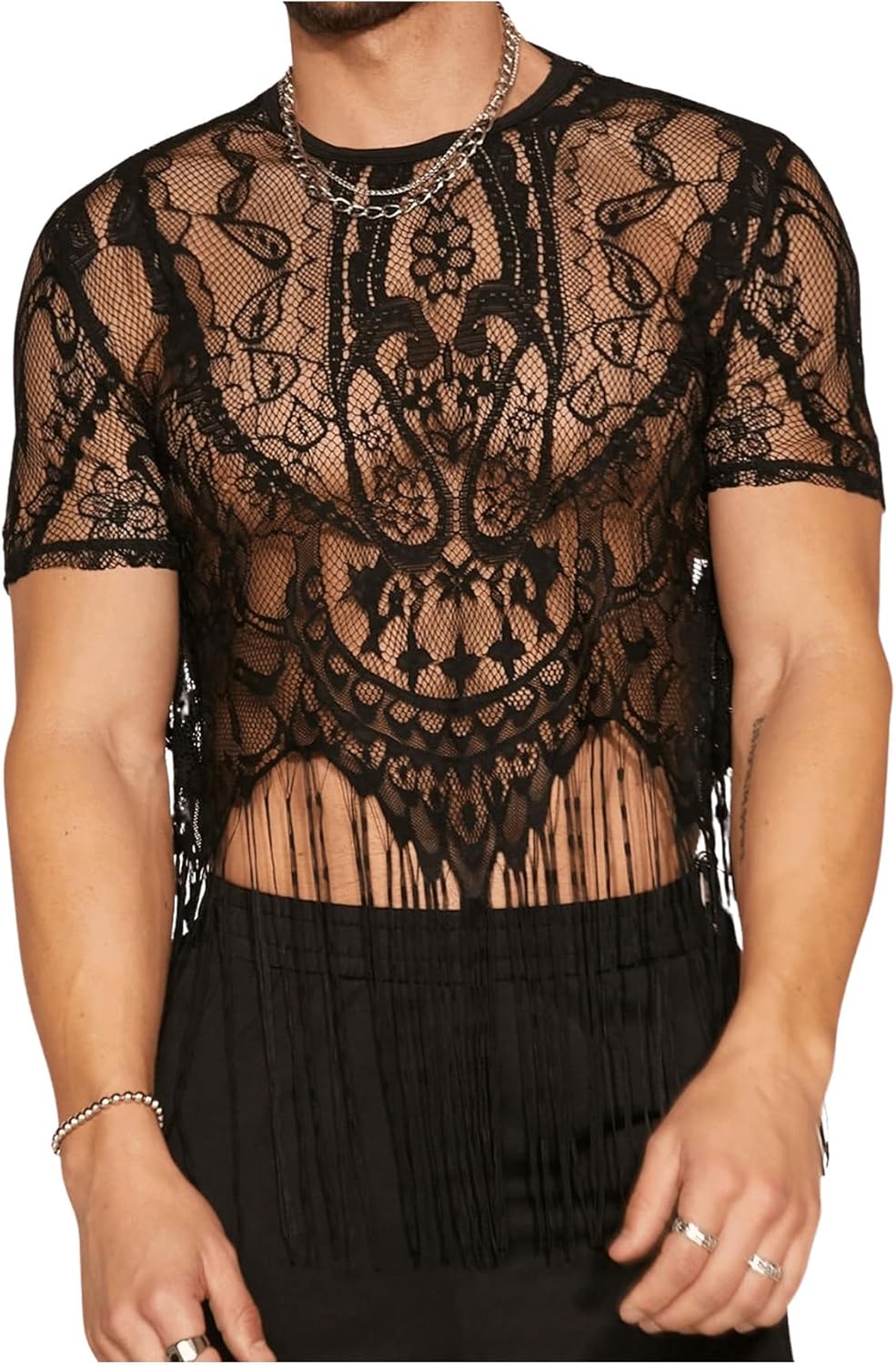 Features: lace top for men, see through, crew neck, short sleeve, fringe hem, cropped, club disco shirt